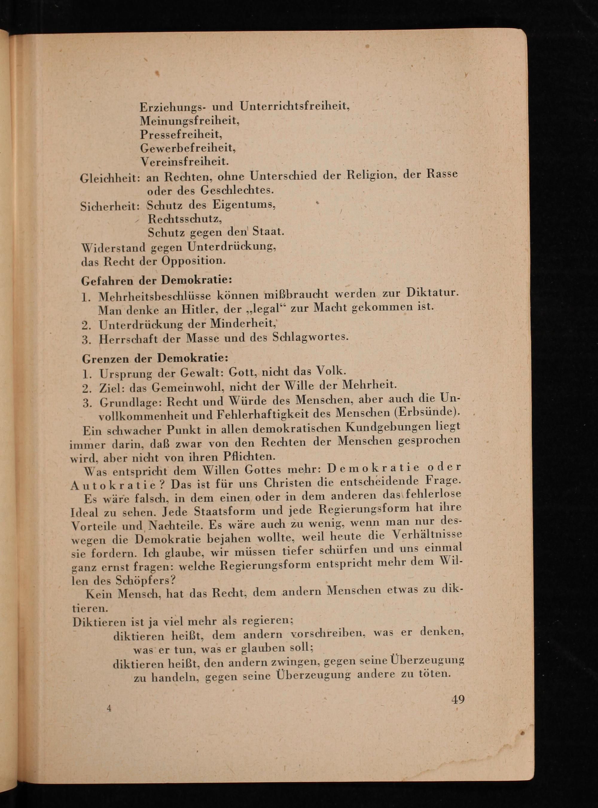 Was entspricht dem Willen Gottes mehr: Demokratie oder Autokratie? Das ist für uns Christen die entscheidende Frage. Es wäre falsch, in dem einen oder in dem anderen das fehlerlose Ideal zu sehen. Jede Staatsform und jede Regierungsform hat ihre Vorteile und Nachteile. Es wäre auch zu wenig, wenn man nur deswegen die Demokratie bejahen wollte, weil heute die Verhältnisse sie fordern. Ich glaube, wir müssen tiefer schürfen und uns einmal ganz ernst fragen: welche Regierungsform entspricht mehr dem Willen des Schöpfers?
