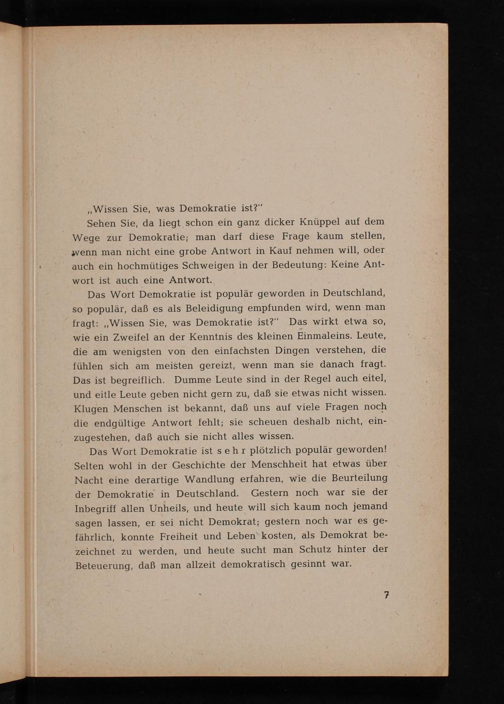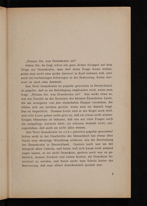 Das Wort Demokratie ist sehr plötzlich populär geworden! Selten wohl in der Geschichte der Menschheit hat etwas über Nacht eine derartige Wandlung erfahren, wie die Beurteilung der Demokratie in Deutschland . Gestern noch war sie der Inbegriff allen Unheils, und heute will sich kaum noch jemand sagen lassen, er sei nicht Demokrat; gestern noch war es gefährlich, konnte Freiheit und Leben kosten, als Demokrat bezeichnet zu werden, und heute sucht man Schutz hinter der Beteuerung, daß man allzeit demokratisch gesinnt war.
