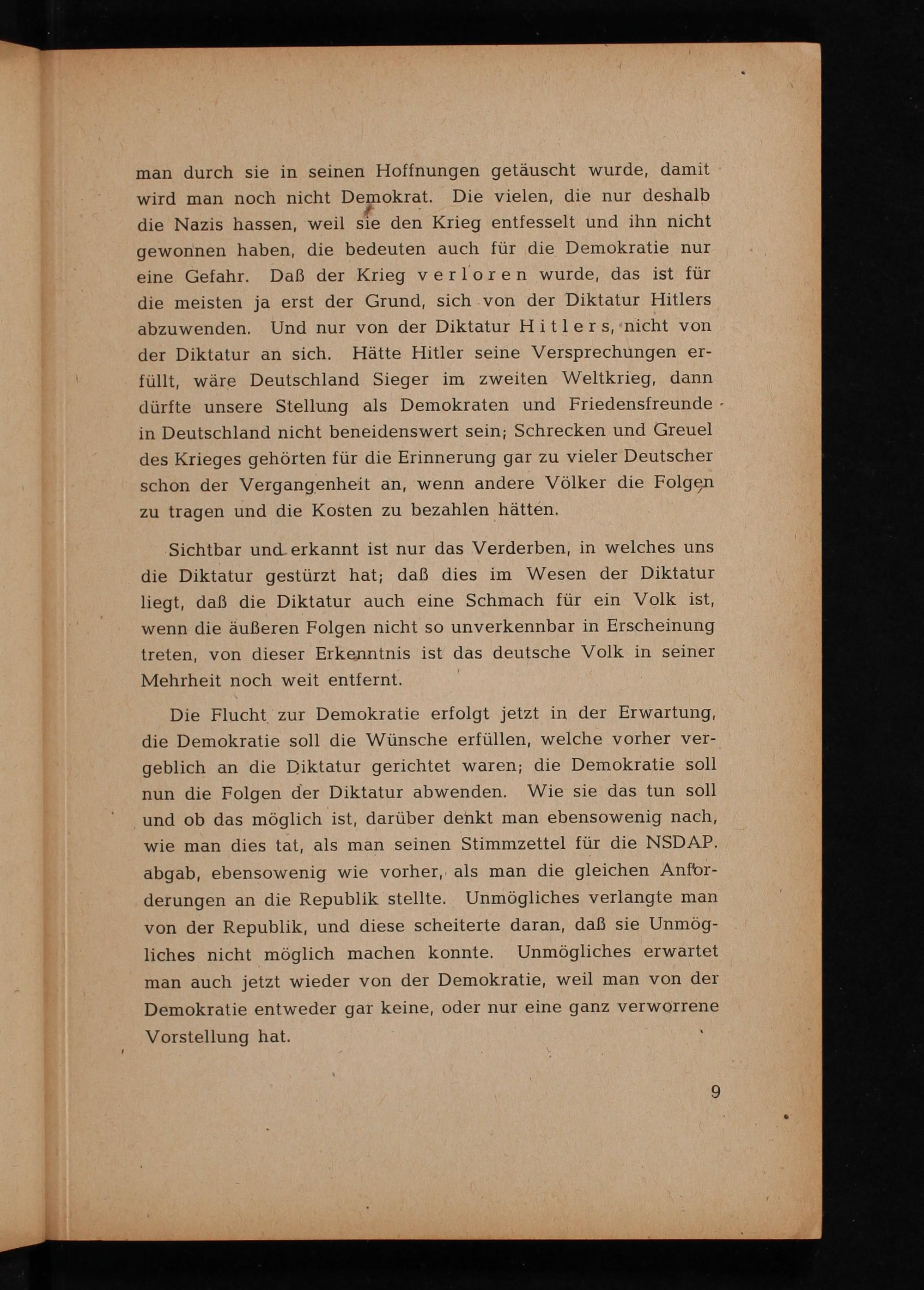 Die Flucht zur Demokratie erfolgt jetzt in der Erwartung, die Demokratie soll die Wünsche erfüllen, welche vorher vergeblich an die Diktatur gerichtet waren; die Demokratie soll nun die Folgen der Diktatur abwenden. Wie sie das tun soll und ob das möglich ist, darüber denkt man ebensowenig nach, wie man dies tat, als man seinen Stimmzettel für die NSDAP . abgab, ebensowenig wie vorher, als man die gleichen Anforderungen an die Republik stellte. Unmögliches verlangte man von der Republik , und diese scheiterte daran, daß sie Unmögliches nicht möglich machen konnte. Unmögliches erwartet man auch jetzt wieder von der Demokratie, weil man von der Demokratie entweder gar keine, oder nur eine ganz verworrene Vorstellung hat.