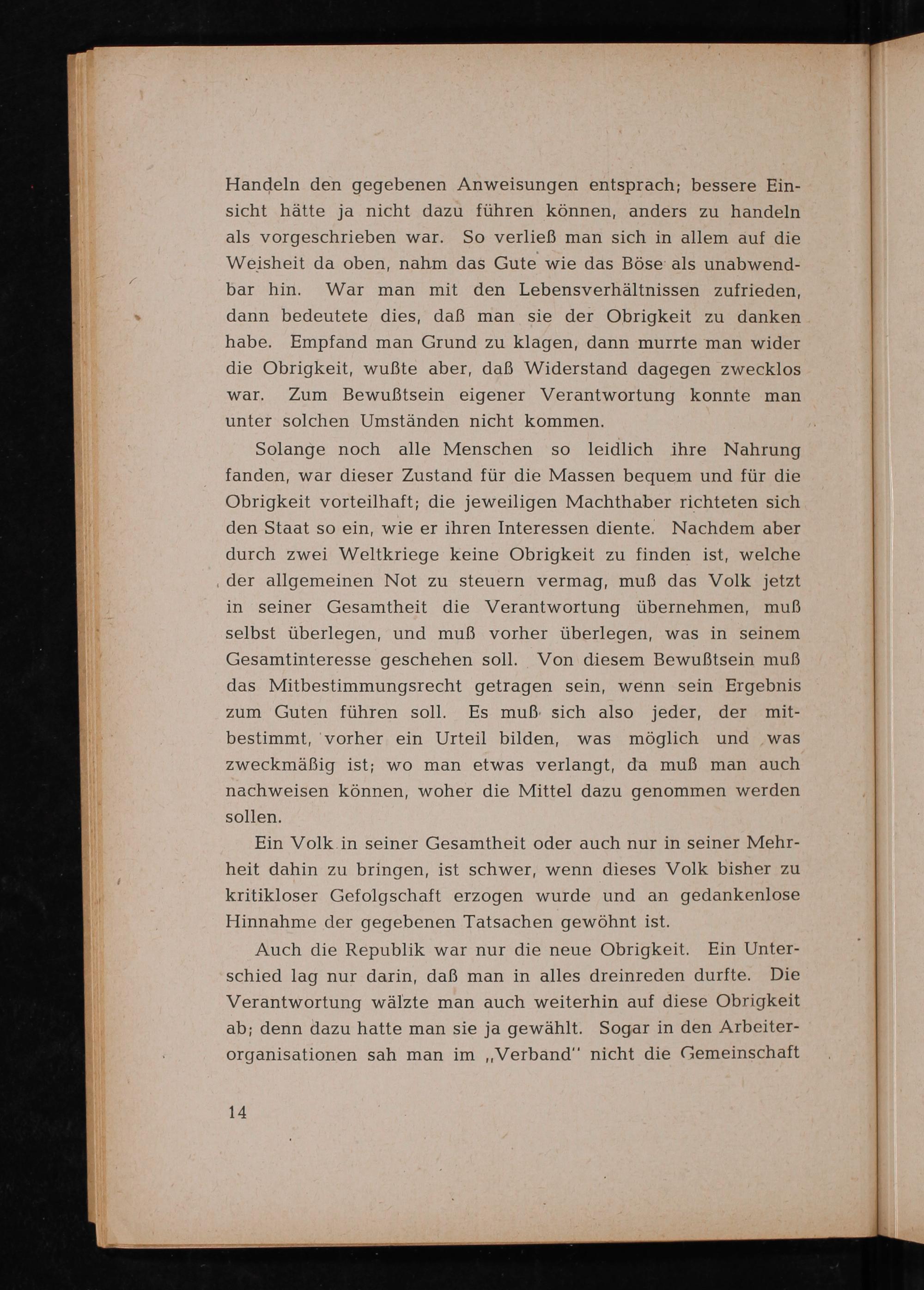 Solange noch alle Menschen so leidlich ihre Nahrung fanden, war dieser Zustand für die Massen bequem und für die Obrigkeit vorteilhaft; die jeweiligen Machthaber richteten sich den Staat so ein, wie er ihren Interessen diente. Nachdem aber durch zwei Weltkriege keine Obrigkeit zu finden ist, welche der allgemeinen Not zu steuern vermag, muß das Volk jetzt in seiner Gesamtheit die Verantwortung übernehmen, muß selbst überlegen, und muß vorher überlegen, was in seinem Gesamtinteresse geschehen soll. Von diesem Bewußtsein muß das Mitbestimmungsrecht getragen sein, wenn sein Ergebnis zum Guten führen soll. Es muß sich also jeder, der mitbestimmt, vorher ein Urteil bilden, was möglich und was zweckmäßig ist; wo man etwas verlangt, da muß man auch nachweisen können, woher die Mittel dazu genommen werden sollen.