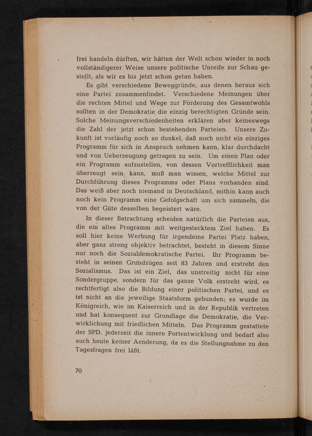 In dieser Betrachtung scheiden natürlich die Parteien aus, die ein altes Programm mit weitgestecktem Ziel haben. Es soll hier keine Werbung für irgendeine Partei Platz haben, aber ganz streng objektiv betrachtet, besteht in diesem Sinne nur noch die Sozialdemokratische Partei . Ihr Programm besteht in seinen Grundzügen seit 83 Jahren und erstrebt den Sozialismus. Das ist ein Ziel, das unstreitig nicht für eine Sondergruppe, sondern für das ganze Volk erstrebt wird, es rechtfertigt also die Bildung einer politischen Partei, und es ist nicht an die jeweilige Staatsform gebunden; es wurde im Königreich, wie im Kaiserreich und in der Republik vertreten und hat konsequent zur Grundlage die Demokratie, die Verwirklichung mit friedlichen Mitteln. Das Programm gestattete der SPD. jederzeit die innere Fortentwicklung und bedarf also auch heute keiner Aenderung, da es die Stellungnahme zu den Tagesfragen frei läßt.