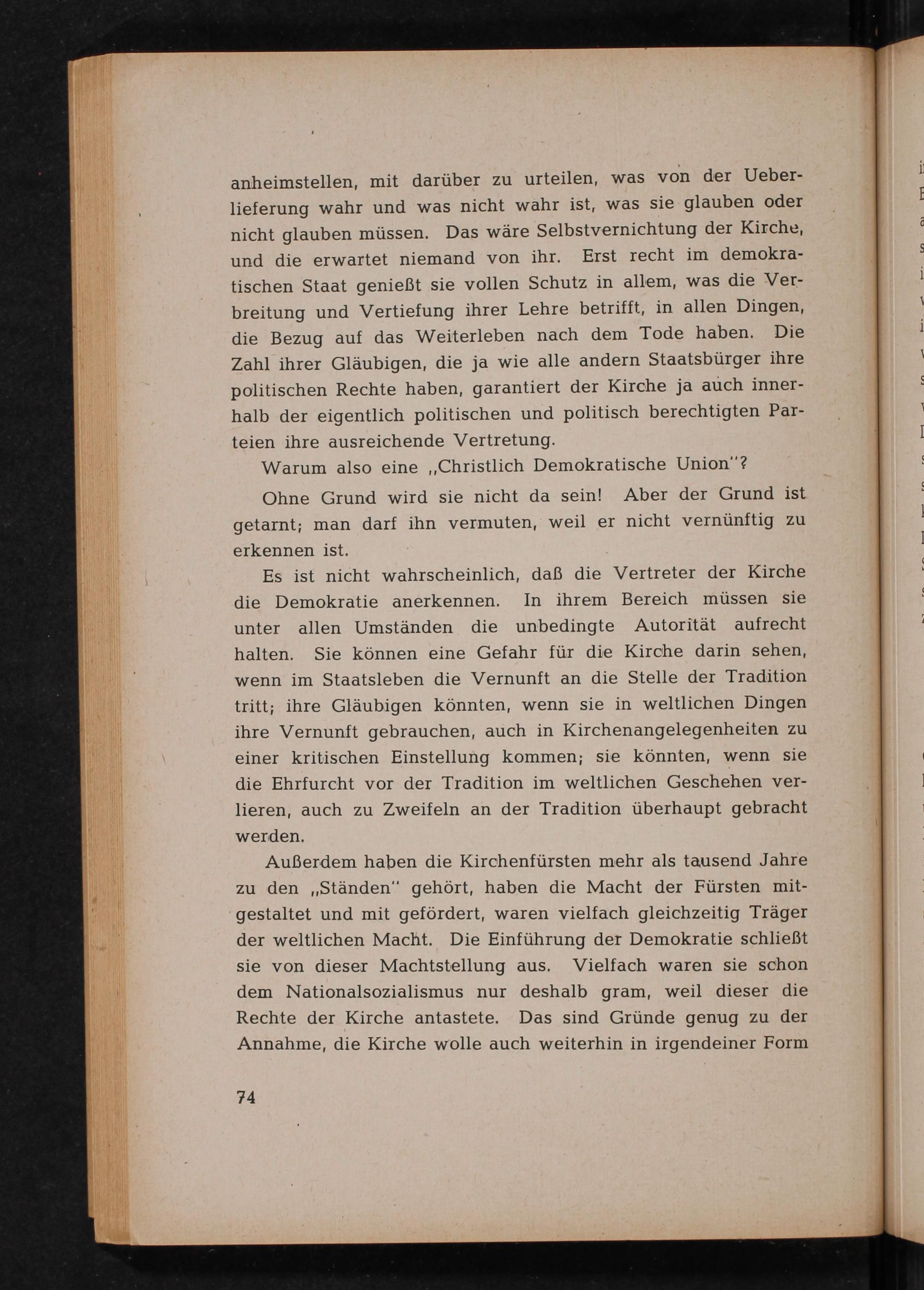 Außerdem haben die Kirchenfürsten mehr als tausend Jahre zu den ,, Ständen" gehört, haben die Macht der Fürsten mitgestaltet und mit gefördert, waren vielfach gleichzeitig Träger der weltlichen Macht. Die Einführung der Demokratie schließt sie von dieser Machtstellung aus. Vielfach waren sie schon dem Nationalsozialismus nur deshalb gram, weil dieser die Rechte der Kirche antastete. Das sind Gründe genug zu der Annahme, die Kirche wolle auch weiterhin in irgendeiner Form