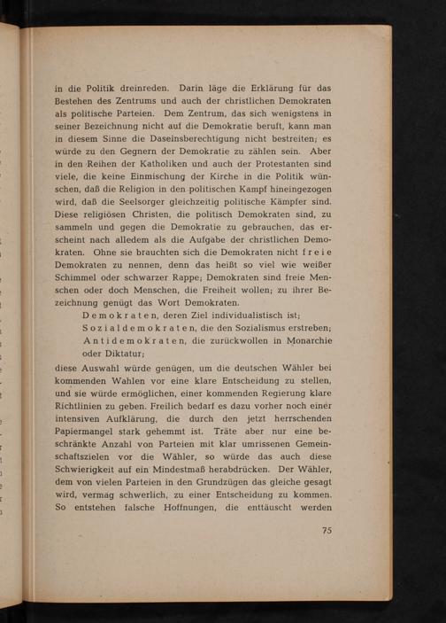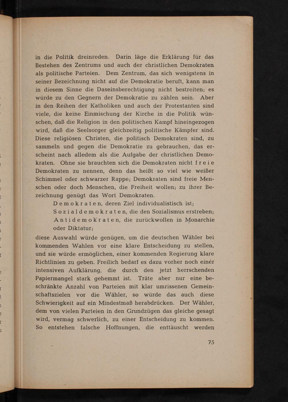 diese Auswahl würde genügen, um die deutschen Wähler bei kommenden Wahlen vor eine klare Entscheidung zu stellen, und sie würde ermöglichen, einer kommenden Regierung klare Richtlinien zu geben. Freilich bedarf es dazu vorher noch einer intensiven Aufklärung, die durch den jetzt herrschenden Papiermangel stark gehemmt ist. Träte aber nur eine beschränkte Anzahl von Parteien mit klar umrissenen Gemeinschaftszielen vor die Wähler, so würde das auch diese Schwierigkeit auf ein Mindestmaß herabdrücken. Der Wähler, dem von vielen Parteien in den Grundzügen das gleiche gesagt wird, vermag schwerlich, zu einer Entscheidung zu kommen. So entstehen falsche Hoffnungen, die enttäuscht werden