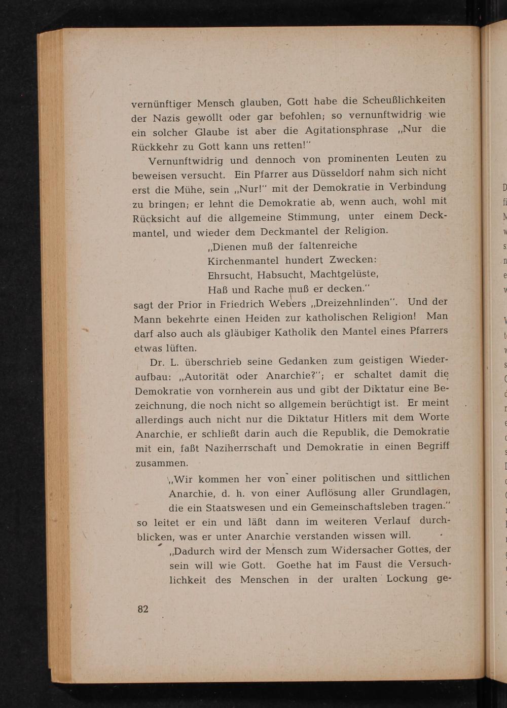Dr. L. überschrieb seine Gedanken zum geistigen Wieder- aufbau:„Autorität oder Anarchie?; er schaltet damit die Demokratie von vornherein aus und gibt der Diktatur eine Be- zeichnung, die noch nicht so allgemein berüchtigt ist. Er meint allerdings auch nicht nur die Diktatur Hitlers mit dem Worte Anarchie, er schließt darin auch die Republik , die Demokratie mit ein, faßt Naziherrschaft und Demokratie in einen Begriff zusammen.