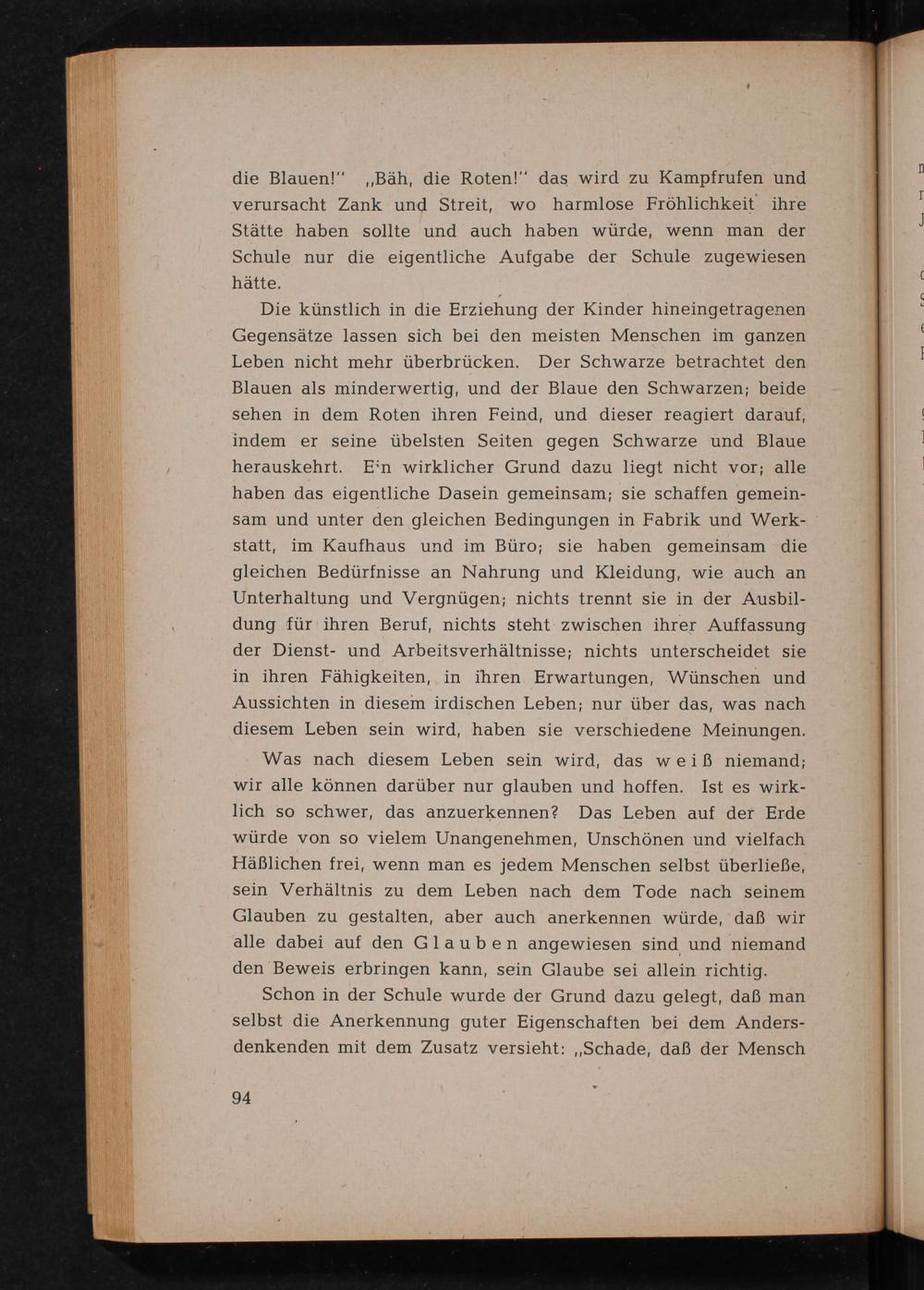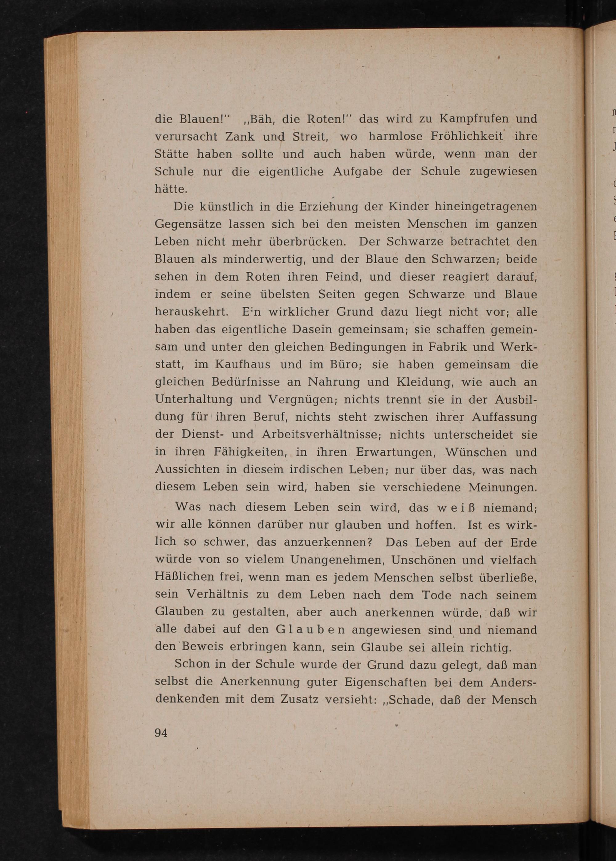 Die künstlich in die Erziehung der Kinder hineingetragenen Gegensätze lassen sich bei den meisten Menschen im ganzen Leben nicht mehr überbrücken. Der Schwarze betrachtet den Blauen als minderwertig, und der Blaue den Schwarzen; beide sehen in dem Roten ihren Feind, und dieser reagiert darauf, indem er seine übelsten Seiten gegen Schwarze und Blaue herauskehrt. Ein wirklicher Grund dazu liegt nicht vor; alle haben das eigentliche Dasein gemeinsam; sie schaffen gemeinsam und unter den gleichen Bedingungen in Fabrik und Werkstatt, im Kaufhaus und im Büro; sie haben gemeinsam die gleichen Bedürfnisse an Nahrung und Kleidung, wie auch an Unterhaltung und Vergnügen; nichts trennt sie in der Ausbildung für ihren Beruf, nichts steht zwischen ihrer Auffassung der Dienst- und Arbeitsverhältnisse; nichts unterscheidet sie in ihren Fähigkeiten, in ihren Erwartungen, Wünschen und Aussichten in diesem irdischen Leben; nur über das, was nach diesem Leben sein wird, haben sie verschiedene Meinungen.