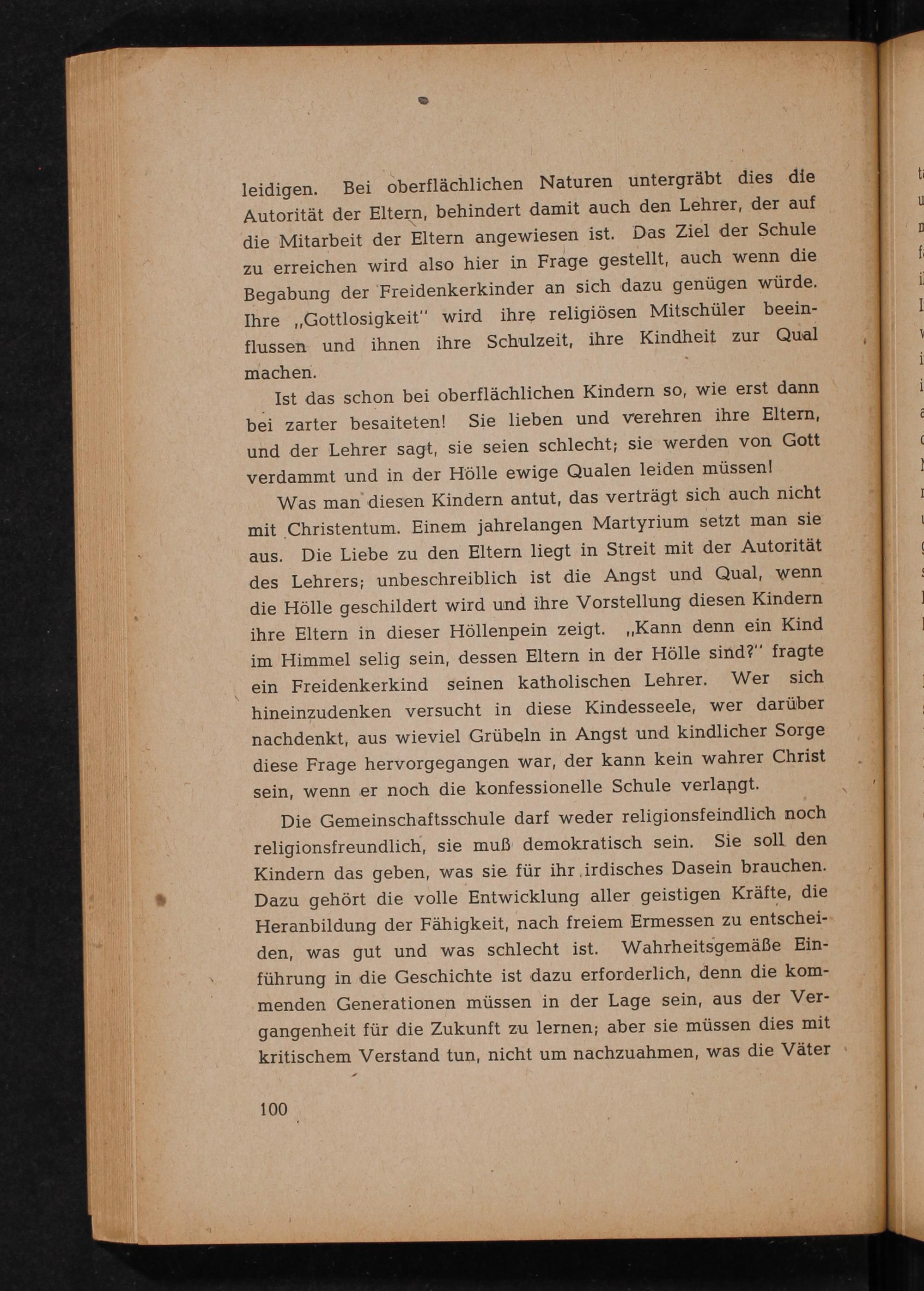leidigen. Bei oberflächlichen Naturen untergräbt dies die Autorität der Eltern, behindert damit auch den Lehrer, der auf die Mitarbeit der Eltern angewiesen ist. Das Ziel der Schule zu erreichen wird also hier in Frage gestellt, auch wenn die Begabung der Freidenkerkinder an sich dazu genügen würde. Ihre Gottlosigkeit" wird ihre religiösen Mitschüler beeinflussen und ihnen ihre Schulzeit, ihre Kindheit zur Qual machen.