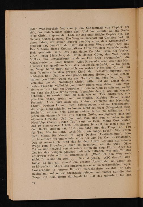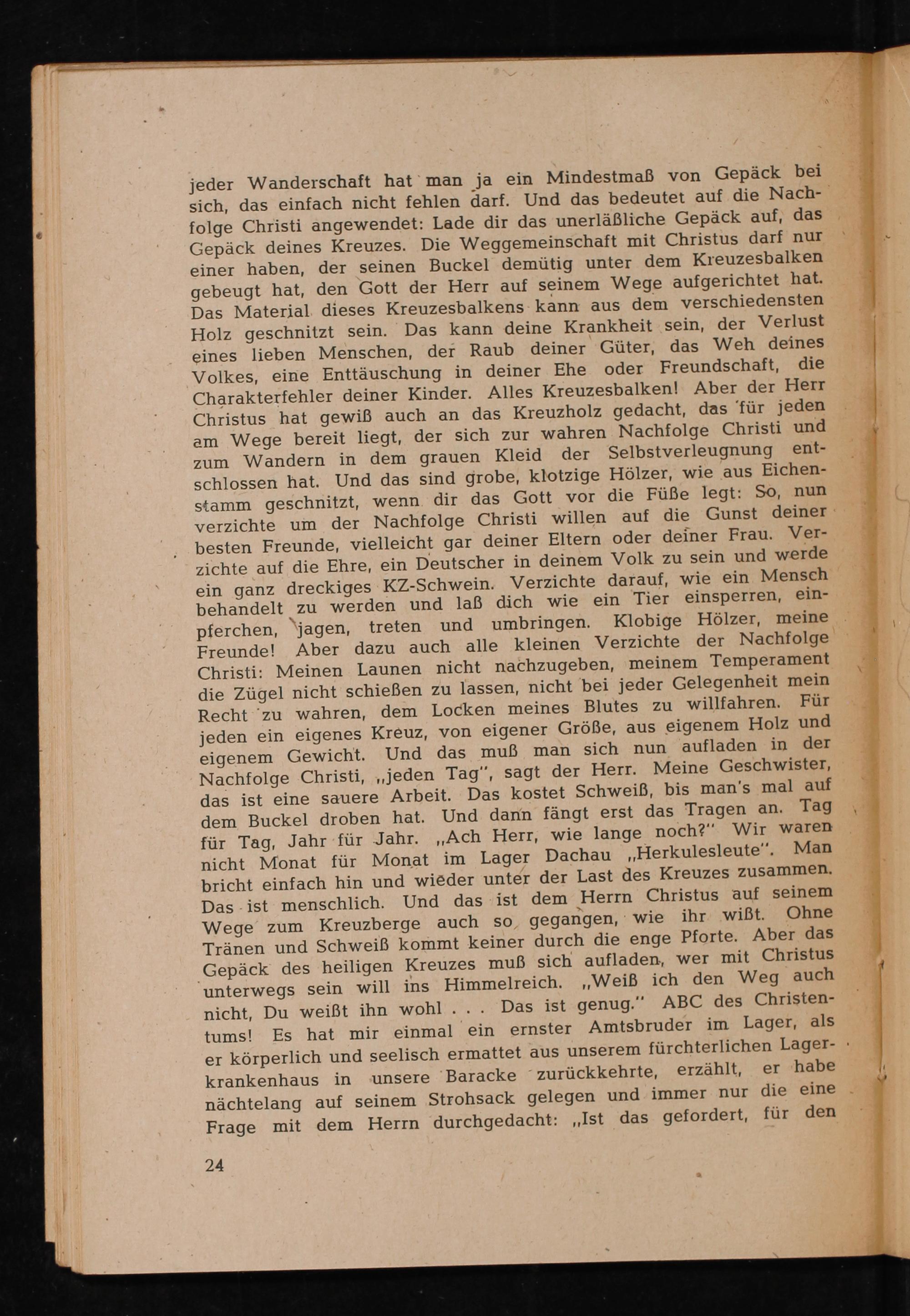 jeder Wanderschaft hat man ja ein Mindestmaß von Gepäck bei sich, das einfach nicht fehlen darf. Und das bedeutet auf die Nachfolge Christi angewendet: Lade dir das unerläßliche Gepäck auf, das Gepäck deines Kreuzes. Die Weggemeinschaft mit Christus darf nur einer haben, der seinen Buckel demütig unter dem Kreuzesbalken gebeugt hat, den Gott der Herr auf seinem Wege aufgerichtet hat. Das Material dieses Kreuzesbalkens kann aus dem verschiedensten Holz geschnitzt sein. Das kann deine Krankheit sein, der Verlust eines lieben Menschen, der Raub deiner Güter, das Weh deines Volkes, eine Enttäuschung in deiner Ehe oder Freundschaft, die Charakterfehler deiner Kinder. Alles Kreuzesbalken! Aber der Herr Christus hat gewiß auch an das Kreuzholz gedacht, das' für jeden am Wege bereit liegt, der sich zur wahren Nachfolge Christi und zum Wandern in dem grauen Kleid der Selbstverleugnung entschlossen hat. Und das sind grobe, klotzige Hölzer, wie aus Eichenstamm geschnitzt, wenn dir das Gott vor die Füße legt: So, nun verzichte um der Nachfolge Christi willen auf die Gunst deiner besten Freunde, vielleicht gar deiner Eltern oder deiner Frau. Verzichte auf die Ehre, ein Deutscher in deinem Volk zu sein und werde ein ganz dreckiges KZ- Schwein. Verzichte darauf, wie ein Mensch behandelt zu werden und laß dich wie ein Tier einsperren, einund umbringen. Klobige Hölzer, meine pferchen, jagen, treten Freunde! Aber dazu auch alle kleinen Verzichte der Nachfolge Christi : Meinen Launen nicht nachzugeben, meinem Temperament die Zügel nicht schießen zu lassen, nicht bei jeder Gelegenheit mein Recht zu wahren, dem Locken meines Blutes zu willfahren. Für jeden ein eigenes Kreuz, von eigener Größe, aus eigenem Holz und eigenem Gewicht. Und das muß man sich nun aufladen in der Nachfolge Christi ,,, jeden Tag", sagt der Herr. Meine Geschwister, das ist eine sauere Arbeit. Das kostet Schweiß, bis man's mal auf dem Buckel droben hat. Und dann fängt erst das Tragen an. Tag für Tag, Jahr für Jahr. ,, Ach Herr, wie lange noch?" Wir waren nicht Monat für Monat im Lager Dachau ,, Herkulesleute". Man bricht einfach hin und wieder unter der Last des Kreuzes zusammen. Das ist menschlich. Und das ist dem Herrn Christus auf seinem Ohne Wege zum Kreuzberge auch so, gegangen, wie ihr wiẞt. Tränen und Schweiß kommt keiner durch die enge Pforte. Aber das Gepäck des heiligen Kreuzes muß sich aufladen, wer mit Christus unterwegs sein will ins Himmelreich. ,, Weiß ich den Weg auch nicht, Du weißt ihn wohl... Das ist genug." ABC des Christentums! Es hat mir einmal ein ernster Amtsbruder im Lager, als er körperlich und seelisch ermattet aus unserem fürchterlichen Lagerer habe krankenhaus in unsere Baracke zurückkehrte, erzählt, nächtelang auf seinem Strohsack gelegen und immer nur die eine Frage mit dem Herrn durchgedacht: ,, Ist das gefordert, für den