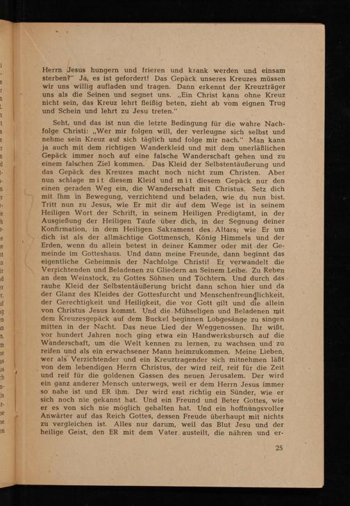 Seht, und das ist nun die letzte Bedingung für die wahre Nachfolge Christi: ,, Wer mir folgen will, der verleugne sich selbst und nehme sein Kreuz auf sich täglich und folge mir nach." Man kann ja auch mit dem richtigen Wanderkleid und mit dem unerläßlichen Gepäck immer noch auf eine falsche Wanderschaft gehen und zu einem falschen Ziel kommen. Das Kleid der Selbstentäußerung und das Gepäck des Kreuzes macht noch nicht zum Christen. Aber nun schlage mit diesem Kleid und mit diesem Gepäck nur den einen geraden Weg ein, die Wanderschaft mit Christus. Setz dich mit Ihm in Bewegung, verzichtend und beladen, wie du nun bist. Tritt nun zu Jesus , wie Er mit dir auf dem Wege ist in seinem Heiligen Wort der Schrift, in seinem Heiligen Predigtamt, in der Ausgießung der Heiligen Taufe über dich, in der Segnung deiner Konfirmation, in dem Heiligen Sakrament des, Altars; wie Er um dich ist als der allmächtige Gottmensch, König Himmels und der Erden, wenn du allein betest in deiner Kammer oder mit der Gemeinde im Gotteshaus. Und dann meine Freunde, dann beginnt das eigentliche Geheimnis der Nachfolge Christi ! Er verwandelt die Verzichtenden und Beladenen zu Gliedern an Seinem Leibe. Zu Reben an dem Weinstock, zu Gottes Söhnen und Töchtern. Und durch das rauhe Kleid der Selbstentäußerung bricht dann schon hier und da der Glanz des Kleides der Gottesfurcht und Menschenfreundlichkeit, der Gerechtigkeit und Heiligkeit, die vor Gott gilt und die allein von Christus Jesus kommt. Und die. Mühseligen und Beladenen mit dem Kreuzesgepäck auf dem Buckel beginnen Lobgesänge zu singen mitten in der Nacht. Das neue Lied der Weggenossen. Ihr wißt, vor hundert Jahren noch ging etwa ein Handwerksbursch auf die Wanderschaft, um die Welt kennen zu lernen, zu wachsen und zu reifen und als ein erwachsener Mann heimzukommen. Meine Lieben, wer als Verzichtender und ein Kreuztragender sich mitnehmen läßt von dem lebendigen Herrn Christus, der wird reif, reif für die Zeit und reif für die goldenen Gassen des neuen Jerusalem . Der wird ein ganz anderer Mensch unterwegs, weil er dem Herrn Jesus immer so nahe ist und ER ihm. Der wird erst richtig ein Sünder, wie er sich noch nie gekannt hat. Und ein Freund und Beter Gottes, wie er es von sich nie möglich gehalten hat. Und ein hoffnungsvoller Anwärter auf das Reich Gottes, dessen Freude überhaupt mit nichts zu vergleichen ist. Alles nur darum, weil das Blut Jesu und der heilige Geist, den ER mit dem Vater, austeilt, die nähren und er