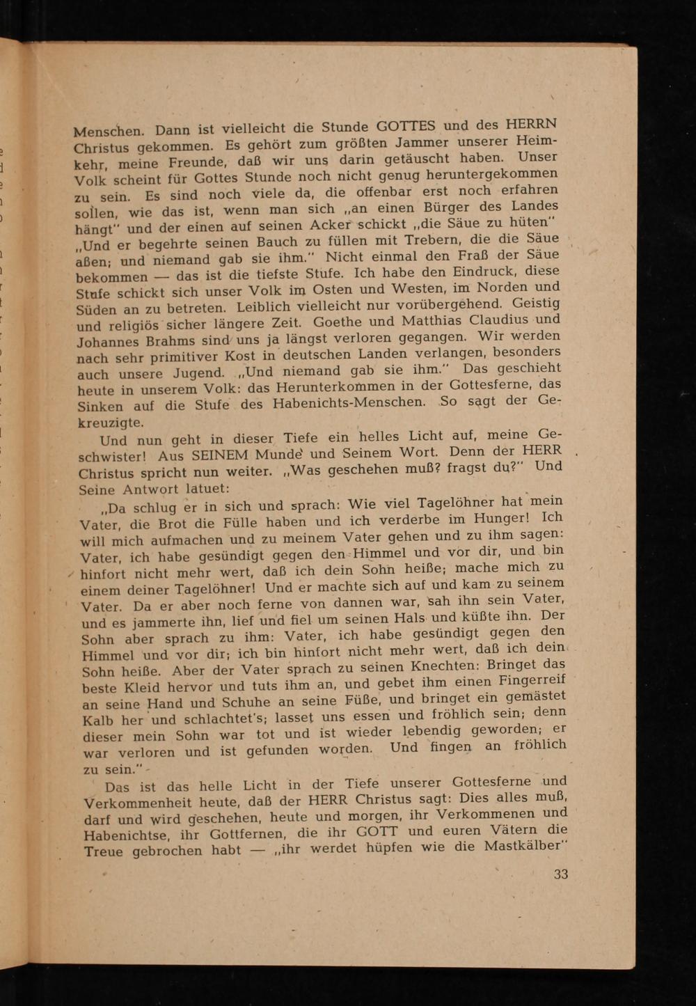 Menschen. Dann ist vielleicht die Stunde GOTTES und des HERRN Christus gekommen. Es gehört zum größten Jammer unserer Heimkehr, meine Freunde, daß wir uns darin getäuscht haben. Unser Volk scheint für Gottes Stunde noch nicht genug heruntergekommen zu sein. Es sind noch viele da, die offenbar erst noch erfahren sollen, wie das ist, wenn man sich ,, an einen Bürger des Landes hängt und der einen auf seinen Acker schickt ,, die Säue zu hüten" ,, Und er begehrte seinen Bauch zu füllen mit Trebern, die die Säue aßen; und niemand gab sie ihm." Nicht einmal den Fraß der Säue bekommen das ist die tiefste Stufe. Ich habe den Eindruck, diese Stufe schickt sich unser Volk im Osten und Westen, im Norden und Süden an zu betreten. Leiblich vielleicht nur vorübergehend. Geistig und religiös sicher längere Zeit. Goethe und Matthias Claudius und Johannes Brahms sind uns ja längst verloren gegangen. Wir werden nach sehr primitiver Kost in deutschen Landen verlangen, besonders auch unsere Jugend. Und niemand gab sie ihm." Das geschieht heute in unserem Volk: das Herunterkommen in der Gottesferne, das Sinken auf die Stufe des Habenichts- Menschen. So sagt der Gekreuzigte.