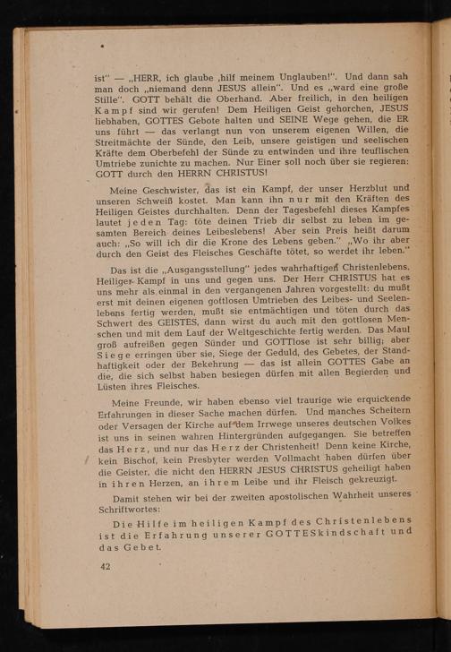 Das ist die ,, Ausgangsstellung" jedes wahrhaftigen Christenlebens. Heiliger Kampf in uns und gegen uns. Der Herr CHRISTUS hat es uns mehr als einmal in den vergangenen Jahren vorgestellt: du mußt erst mit deinen eigenen gottlosen Umtrieben des Leibes- und Seelenlebens fertig werden, mußt sie entmächtigen und töten durch das Schwert des GEISTES, dann wirst du auch mit den gottlosen Menschen und mit dem Lauf der Weltgeschichte fertig werden. Das Maul groß aufreißen gegen Sünder und GOTTlose ist sehr billig; aber Siege erringen über sie, Siege der Geduld, des Gebetes, der Standhaftigkeit oder der Bekehrung das ist allein GOTTES Gabe an die, die sich selbst haben besiegen dürfen mit allen Begierden und Lüsten ihres Fleisches..