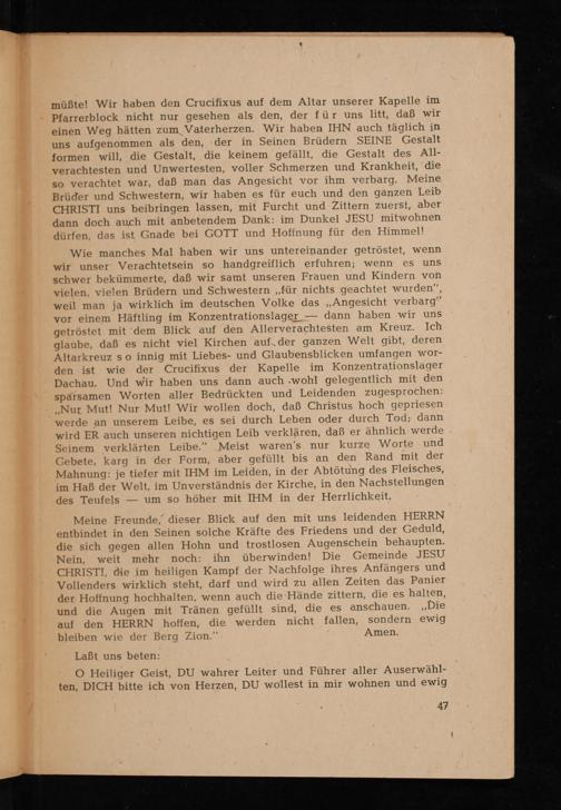 Wie manches Mal haben wir uns untereinander getröstet, wenn wir unser Verachtetsein so handgreiflich erfuhren; wenn schwer bekümmerte, daß wir samt unseren Frauen und Kindern von vielen, vielen Brüdern und Schwestern ,, für nichts geachtet wurden", weil man ja wirklich im deutschen Volke das Angesicht verbarg" dann haben wir uns vor einem Häftling im Konzentrationslager- getröstet mit dem Blick auf den Allerverachtesten am Kreuz. Ich glaube, daß es nicht viel Kirchen auf der ganzen Welt gibt, deren Altarkreuz so innig mit Liebes- und Glaubensblicken umfangen worden ist wie der Crucifixus der Kapelle im Konzentrationslager Dachau . Und wir haben uns dann auch wohl gelegentlich mit den sparsamen Worten aller Bedrückten und Leidenden zugesprochen: ,, Nur Mut! Nur Mut! Wir wollen doch, daß Christus hoch gepriesen werde an unserem Leibe, es sei durch Leben oder durch Tod; dann wird ER auch unseren nichtigen Leib verklären, daß er ähnlich werde Seinem verklärten Leibe." Meist waren's nur kurze Worte und Gebete, karg in der Form, aber gefüllt bis an den Rand mit der Mahnung: je tiefer mit IHM im Leiden, in der Abtötung des Fleisches, im Haß der Welt, im Unverständnis der Kirche, in den Nachstellungen des Teufels um so höher mit IHM in der Herrlichkeit,