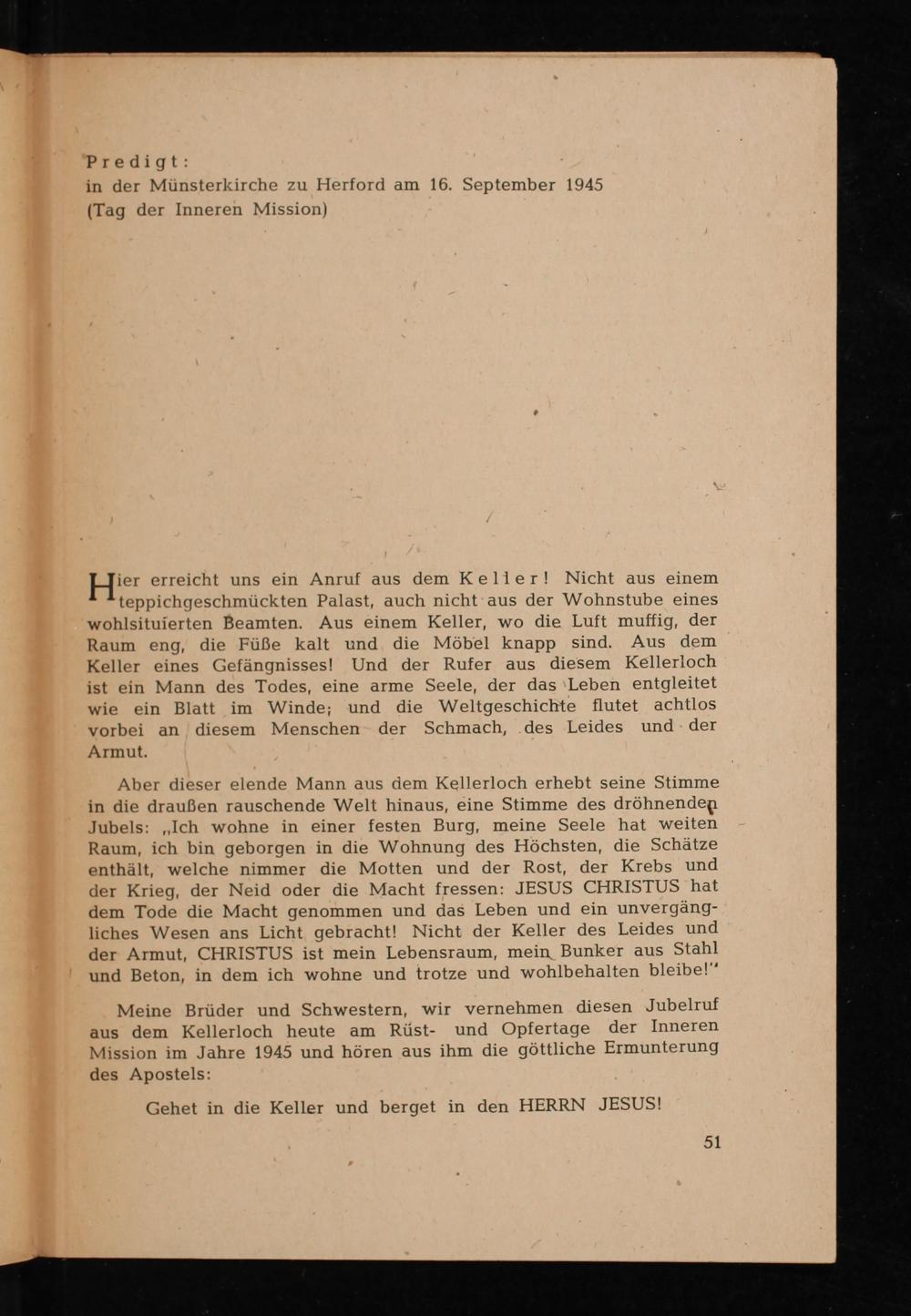 Meine Brüder und Schwestern, wir vernehmen diesen Jubelruf aus dem Kellerloch heute am Rüst- und Opfertage der Inneren Mission im Jahre 1945 und hören aus ihm die göttliche Ermunterung des Apostels: