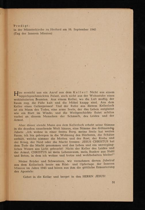 Aber dieser elende Mann aus dem Kellerloch erhebt seine Stimme in die draußen rauschende Welt hinaus, eine Stimme des dröhnenden Jubels: Ich wohne in einer festen Burg, meine Seele hat weiten Raum, ich bin geborgen in die Wohnung des Höchsten, die Schätze enthält, welche nimmer die Motten und der Rost, der Krebs und der Krieg, der Neid oder die Macht fressen: JESUS CHRISTUS hat dem Tode die Macht genommen und das Leben und ein unvergängliches Wesen ans Licht gebracht! Nicht der Keller des Leides und der Armut, CHRISTUS ist mein Lebensraum, mein Bunker aus Stahl und Beton, in dem ich wohne und trotze und wohlbehalten bleibe!"