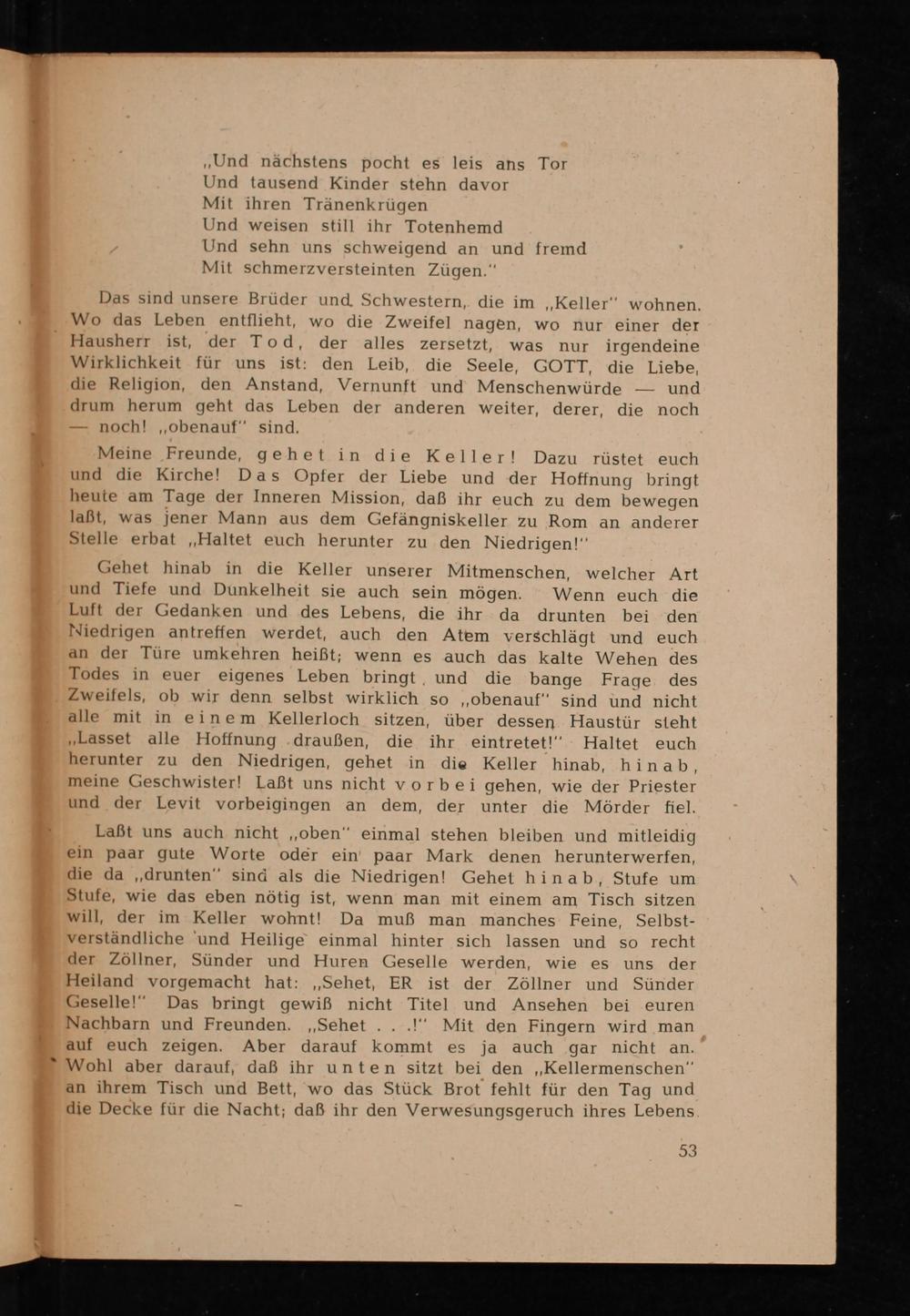 Meine Freunde gehet in die Keller! Dazu rüstet euch und die Kirche! Das Opfer der Liebe und der Hoffnung bringt heute am Tage der Inneren Mission, daß ihr euch zu dem bewegen laßt, was jener Mann aus dem Gefängniskeller zu Rom an anderer Stelle erbat„Haltet euch herunter zu den Niedrigen!”