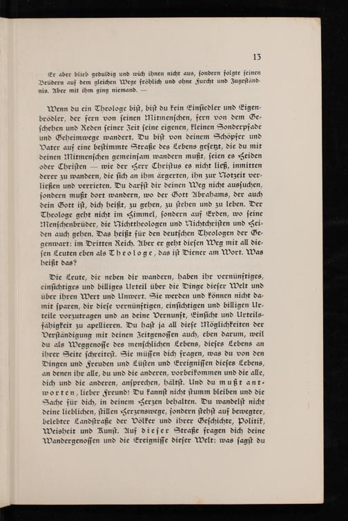 Wenn du ein Theologe bist, bist du kein Einsiedler und Eigenbrödler, der fern von seinen Mitmenschen, fern von dem Geschehen und Reden seiner Zeit seine eigenen, kleinen Sonderpfade und Geheimwege wandert. Du bist von deinem Schöpfer und Vater auf eine bestimmte Straße des Lebens gesetzt, die du mit deinen Mitmenschen gemeinsam wandern mußt, seien es Heiden oder Christen- wie der Herr Christus es nicht ließ, inmitten derer zu wandern, die sich an ihm ärgerten, ihn zur Notzeit verließen und verrieten. Du darfst dir deinen Weg nicht aussuchen, sondern mußt dort wandern, wo der Gott Abrahams, der auch dein Gott ist, dich heißt, zu gehen, zu stehen und zu leben. Der Theologe geht nicht im Himmel, sondern auf Erden, wo seine Menschenbrüder, die nichttheologen und Nichtchristen und Heiden auch gehen. Das heißt für den deutschen Theologen der Gegenwart: im Dritten Reich . Aber er geht diesen Weg mit all diesen Leuten eben als Theologe, das ist Diener am Wort. Was heißt das?