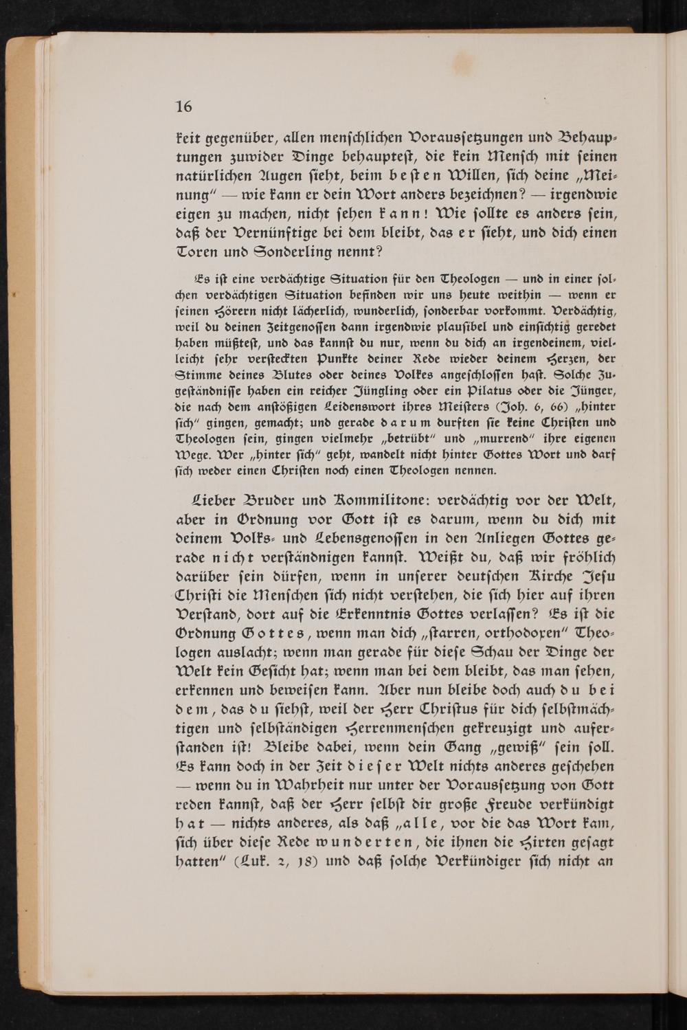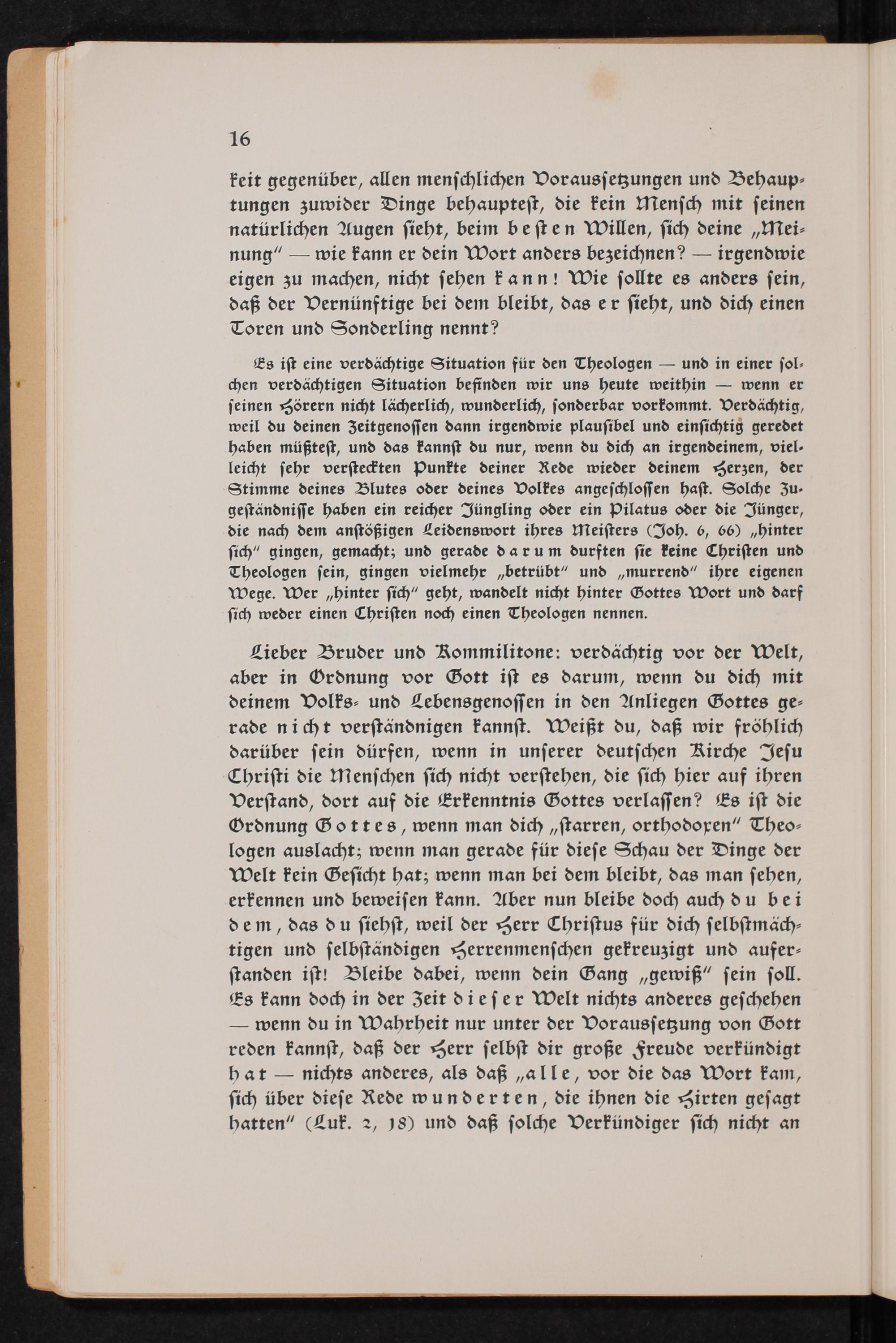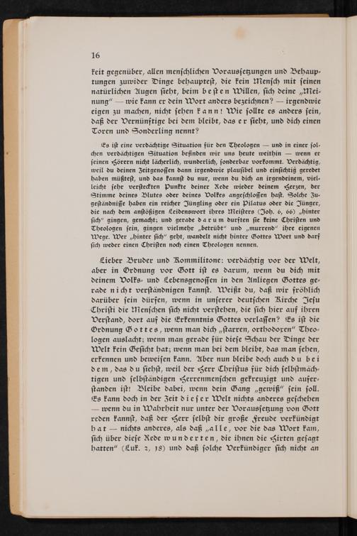 Lieber Bruder und Kommilitone: verdächtig vor der Welt, aber in Ordnung vor Gott ist es darum, wenn du dich mit deinem Volks- und Lebensgenossen in den Anliegen Gottes gerade nicht verständnigen kannst. Weißt du, daß wir fröhlich darüber sein dürfen, wenn in unserer deutschen Kirche Jesu Christi die Menschen sich nicht verstehen, die sich hier auf ihren Verstand, dort auf die Erkenntnis Gottes verlassen? Es ist die Ordnung Gottes, wenn man dich starren, orthodoren" Theologen auslacht; wenn man gerade für diese Schau der Dinge der Welt kein Gesicht hat; wenn man bei dem bleibt, das man sehen, erkennen und beweisen kann. Aber nun bleibe doch auch du bei dem, das du siehst, weil der Herr Christus für dich selbstmächtigen und selbständigen Herrenmenschen gekreuzigt und auferstanden ist! Bleibe dabei, wenn dein Gang gewiß" sein soll. Es kann doch in der Zeit dieser Welt nichts anderes geschehen - wenn du in Wahrheit nur unter der Voraussetzung von Gott reden kannst, daß der Herr selbst dir große Freude verkündigt hat ― nichts anderes, als daß alle, vor die das Wort kam, sich über diese Rede wunderten, die ihnen die Hirten gesagt hatten"( Luk. 2, 18) und daß solche Verkündiger sich nicht an