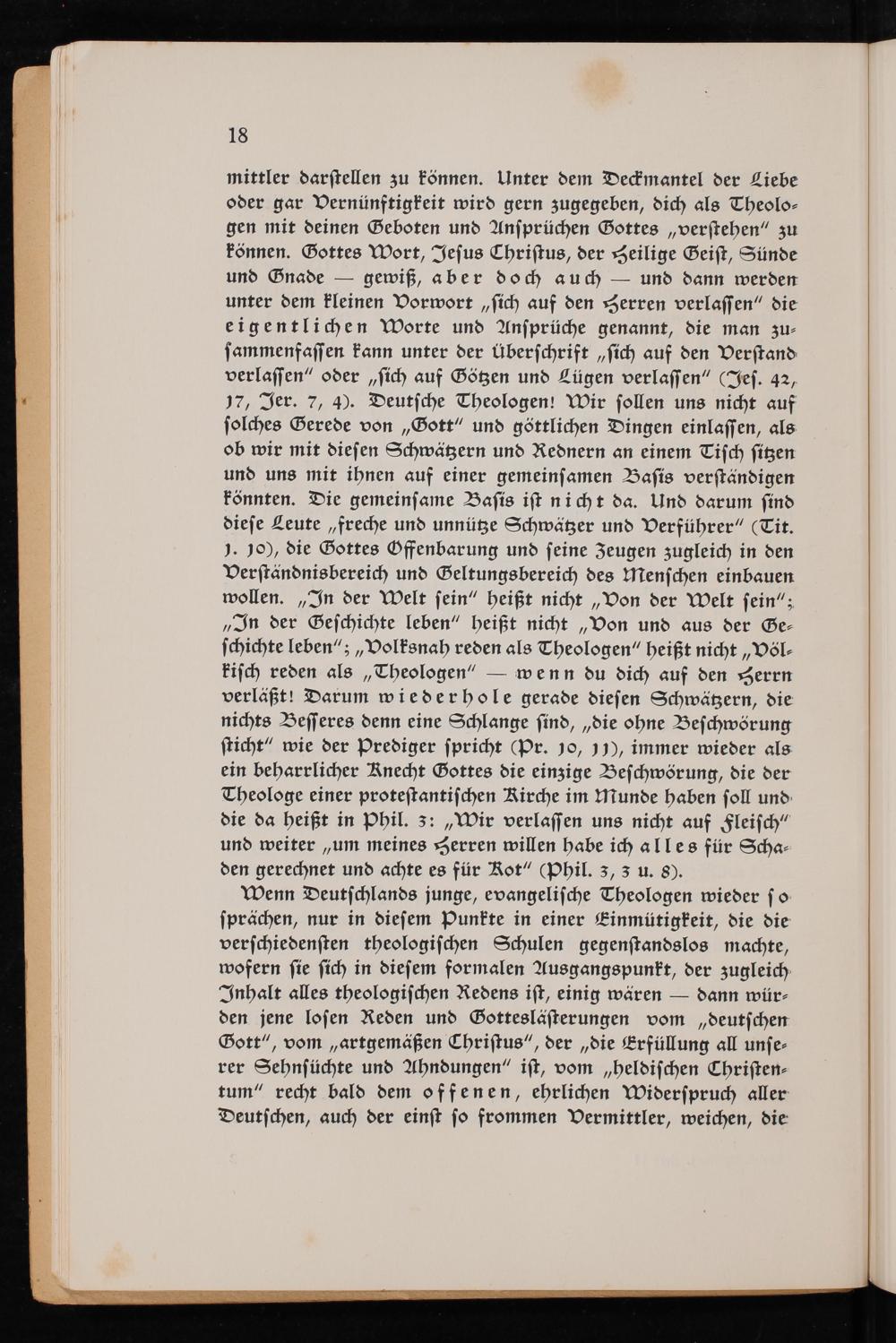 mittler darstellen zu können. Unter dem Deckmantel der Liebe oder gar Vernünftigkeit wird gern zugegeben, dich als Theolo­gen mit deinen Geboten und Ansprüchen Gottes verstehen" zu können. Gottes Wort, Jesus Christus , der Heilige Geist, Sünde und Gnade gewiß, aber doch auch und dann werden unter dem kleinen Vorwort sich auf den Herren verlassen" die eigentlichen Worte und Ansprüche genannt, die man zu­sammenfassen kann unter der überschrift sich auf den Verstand verlassen" oder sich auf Götzen und Lügen verlassen"( Jes. 42, 17, Jer. 7, 4). Deutsche Theologen! Wir sollen uns nicht auf solches Gerede von Gott " und göttlichen Dingen einlassen, als ob wir mit diesen Schwätzern und Rednern an einem Tisch sitzen und uns mit ihnen auf einer gemeinsamen Basis verständigen könnten. Die gemeinsame Basis ist nicht da. Und darum sind diese Leute ,, freche und unnütze Schwätzer und Verführer"( Tit. 1. 10), die Gottes Offenbarung und seine Zeugen zugleich in den Verständnisbereich und Geltungsbereich des Menschen einbauen wollen. In der Welt sein" heißt nicht ,, Von der Welt sein"; " In der Geschichte leben" heißt nicht Von und aus der Ge­schichte leben"; ,, Volksnah reden als Theologen" heißt nicht Völ­kisch reden als Theologen"- wenn du dich auf den Herrn verläßt! Darum wiederhole gerade diesen Schwätzern, die nichts Besseres denn eine Schlange sind, die ohne Beschwörung sticht" wie der Prediger spricht( Pr. 10, 11), immer wieder als ein beharrlicher Knecht Gottes die einzige Beschwörung, die der Theologe einer protestantischen Kirche im Munde haben soll und die da heißt in Phil. 3: Wir verlassen uns nicht auf Fleisch" und weiter ,, um meines Herren willen habe ich alles für Scha den gerechnet und achte es für Rot"( Phil. 3, 3 u. 8).