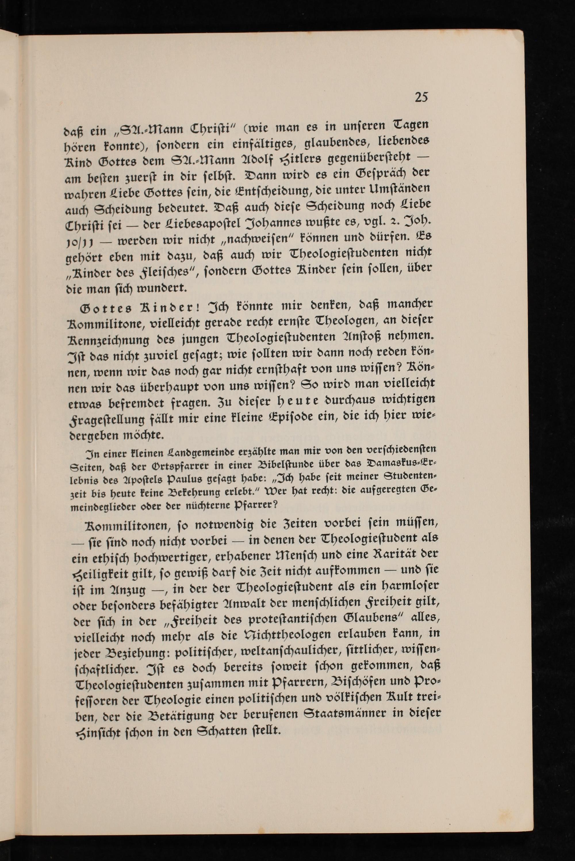 daß ein„ SA.- Mann Christi"( wie man es in unseren Tagen hören konnte), sondern ein einfältiges, glaubendes, liebendes Rind Gottes dem SA.- Mann Adolf Hitlers gegenübersteht am besten zuerst in dir selbst. Dann wird es ein Gespräch der wahren Liebe Gottes sein, die Entscheidung, die unter Umständen auch Scheidung bedeutet. Daß auch diese Scheidung noch Liebe Christi sei der Liebesapostel Johannes wußte es, vgl. 2. Joh. 10/11 werden wir nicht ,, nachweisen" können und dürfen. Es gehört eben mit dazu, daß auch wir Theologiestudenten nicht ,, Kinder des Fleisches", sondern Gottes Kinder sein sollen, über die man sich wundert.