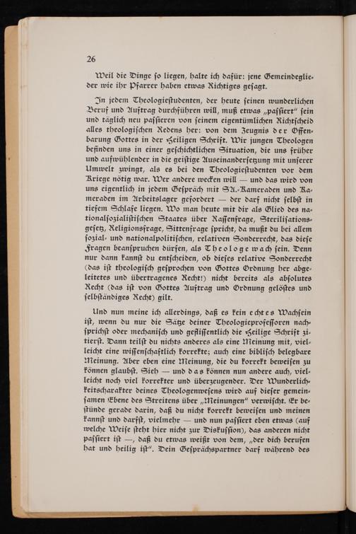 In jedem Theologiestudenten, der heute seinen wunderlichen Beruf und Auftrag durchführen will, muß etwas passiert" sein und täglich neu passieren von seinem eigentümlichen Richtscheid alles theologischen Redens her: von dem Zeugnis der Offenbarung Gottes in der Heiligen Schrift. Wir jungen Theologen befinden uns in einer geschichtlichen Situation, die uns früher und aufwühlender in die geistige Auseinandersetzung mit unserer Umwelt zwingt, als es bei den Theologiestudenten vor dem Kriege nötig war. Wer andere wecken will und das wird von uns eigentlich in jedem Gespräch mit SA.- Rameraden und Rameraden im Arbeitslager gefordert der darf nicht selbst in tiefem Schlafe liegen. Wo man heute mit dir als Glied des nationalsozialistischen Staates über Rassenfrage, Sterilisationsgesetz, Religionsfrage, Sittenfrage spricht, da mußt du bei allem sozial- und nationalpolitischen, relativen Sonderrecht, das diese fragen beanspruchen dürfen, als Theologe wach sein. Denn nur dann kannst du entscheiden, ob dieses relative Sonderrecht ( das ist theologisch gesprochen von Gottes Ordnung her abgeleitetes und übertragenes Recht!) nicht bereits als absolutes Recht( das ist von Gottes Auftrag und Ordnung gelöstes und selbständiges Recht) gilt.