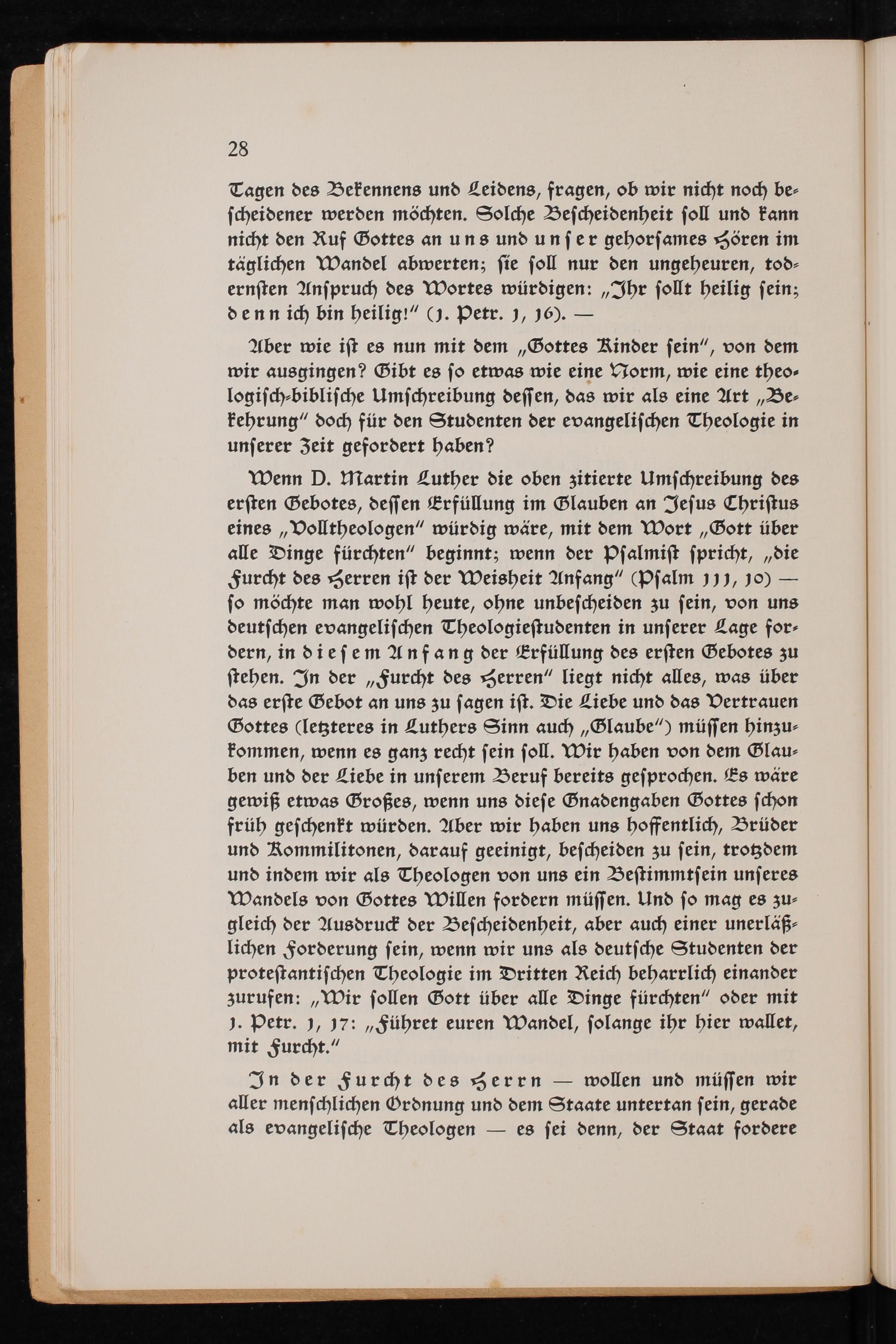 Wenn D. Martin Luther die oben zitierte Umschreibung des ersten Gebotes, dessen Erfüllung im Glauben an Jesus Christus eines ,, Volltheologen" würdig wäre, mit dem Wort„ Gott über alle Dinge fürchten" beginnt; wenn der Psalmist spricht,„ die Furcht des Herren ist der Weisheit Anfang"( Psalm 111, 10)- so möchte man wohl heute, ohne unbescheiden zu sein, von uns deutschen evangelischen Theologiestudenten in unserer Lage fordern, in diesem Anfang der Erfüllung des ersten Gebotes zu stehen. In der Furcht des Herren" liegt nicht alles, was über das erste Gebot an uns zu sagen ist. Die Liebe und das Vertrauen Gottes( letzteres in Luthers Sinn auch„ Glaube") müssen hinzukommen, wenn es ganz recht sein soll. Wir haben von dem Glauben und der Liebe in unserem Beruf bereits gesprochen. Es wäre gewiß etwas Großes, wenn uns diese Gnadengaben Gottes schon früh geschenkt würden. Aber wir haben uns hoffentlich, Brüder und Rommilitonen, darauf geeinigt, bescheiden zu sein, trotzdem und indem wir als Theologen von uns ein Bestimmtsein unseres Wandels von Gottes Willen fordern müssen. Und so mag es zugleich der Ausdruck der Bescheidenheit, aber auch einer unerläßlichen Forderung sein, wenn wir uns als deutsche Studenten der protestantischen Theologie im Dritten Reich beharrlich einander zurufen:„ Wir sollen Gott über alle Dinge fürchten" oder mit 1. Petr. 1, 17:" Führet euren Wandel, solange ihr hier wallet, mit Furcht."