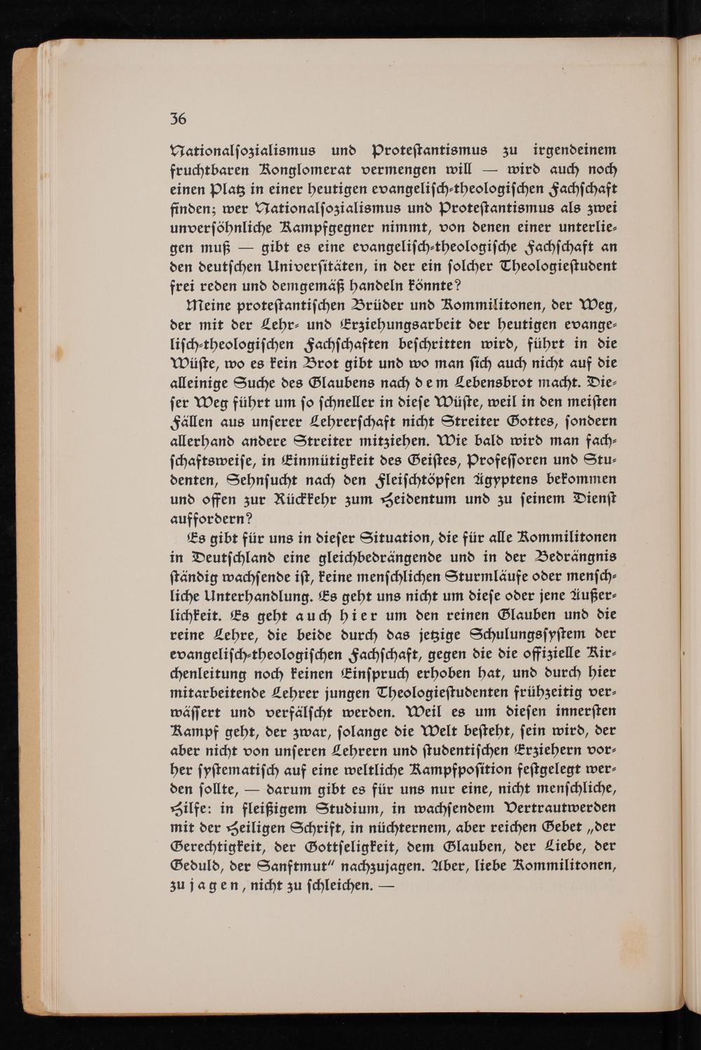 Es gibt für uns in dieser Situation, die für alle Kommilitonen in Deutschland eine gleichbedrängende und in der Bedrängnis ständig wachsende ist, keine menschlichen Sturmläufe oder menschliche Unterhandlung. Es geht uns nicht um diese oder jene äußerlichkeit. Es geht auch hier um den reinen Glauben und die reine Lehre, die beide durch das jetzige Schulungssystem der evangelisch- theologischen Fachschaft, gegen die die offizielle Rirchenleitung noch keinen Einspruch erhoben hat, und durch hier mitarbeitende Lehrer jungen Theologiestudenten frühzeitig verwässert und verfälscht werden. Weil es um diesen innersten Rampf geht, der zwar, solange die Welt besteht, sein wird, der aber nicht von unseren Lehrern und studentischen Erziehern vorher systematisch auf eine weltliche Rampfposition festgelegt werden sollte, - darum gibt es für uns nur eine, nicht menschliche, Silfe: in fleißigem Studium, in wachsendem Vertrautwerden mit der Heiligen Schrift, in nüchternem, aber reichen Gebet ,, der Gerechtigkeit, der Gottseligkeit, dem Glauben, der Liebe, der Geduld, der Sanftmut" nachzujagen. Aber, liebe Kommilitonen, zu jagen, nicht zu schleichen.