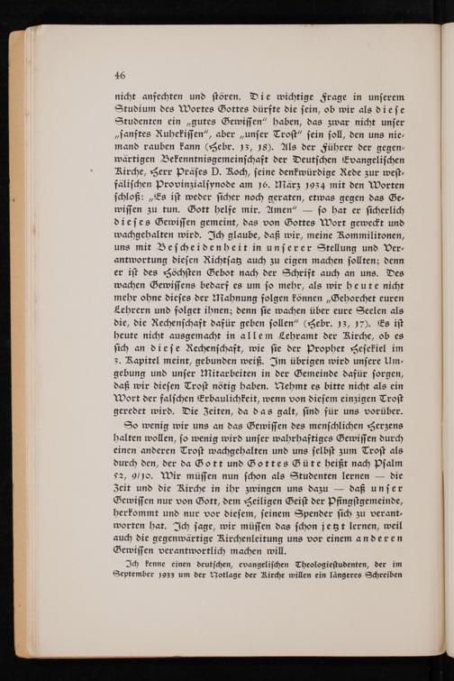 nicht anfechten und stören. Die wichtige Frage in unserem Studium des Wortes Gottes dürfte die sein, ob wir als diese Studenten ein gutes Gewissen" haben, das zwar nicht unser " sanftes Ruhekissen", aber unser Trost" sein soll, den uns niemand rauben kann( Hebr . 13, 18). Als der Führer der gegenwärtigen Bekenntnisgemeinschaft der Deutschen Evangelischen Kirche , Herr Präses D. Roch, seine denkwürdige Rede zur westfälischen Provinzialsynode am 16. März 1934 mit den Worten schloß:„ Es ist weder sicher noch geraten, etwas gegen das Gewissen zu tun. Gott helfe mir. Amen" so hat er sicherlich dieses Gewissen gemeint, das von Gottes Wort geweckt und wachgehalten wird. Ich glaube, daß wir, meine Kommilitonen, uns mit Bescheidenheit in unserer Stellung und Verantwortung diesen Richtsatz auch zu eigen machen sollten; denn er ist des Höchsten Gebot nach der Schrift auch an uns. Des wachen Gewissens bedarf es um so mehr, als wir heute nicht mehr ohne dieses der Mahnung folgen können ,, Gehorchet euren Lehrern und folget ihnen; denn sie wachen über eure Seelen als die, die Rechenschaft dafür geben sollen"( Hebr . 13, 17). Es ist heute nicht ausgemacht in allem Lehramt der Kirche, ob es sich an diese Rechenschaft, wie sie der Prophet Hesekiel im 3. Rapitel meint, gebunden weiß. Im übrigen wird unsere Umgebung und unser Mitarbeiten in der Gemeinde dafür sorgen, daß wir diesen Trost nötig haben. Nehmt es bitte nicht als ein Wort der falschen Erbaulichkeit, wenn von diesem einzigen Trost geredet wird. Die Zeiten, da das galt, sind für uns vorüber.