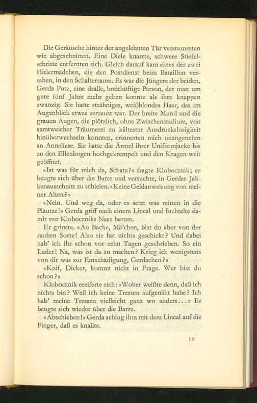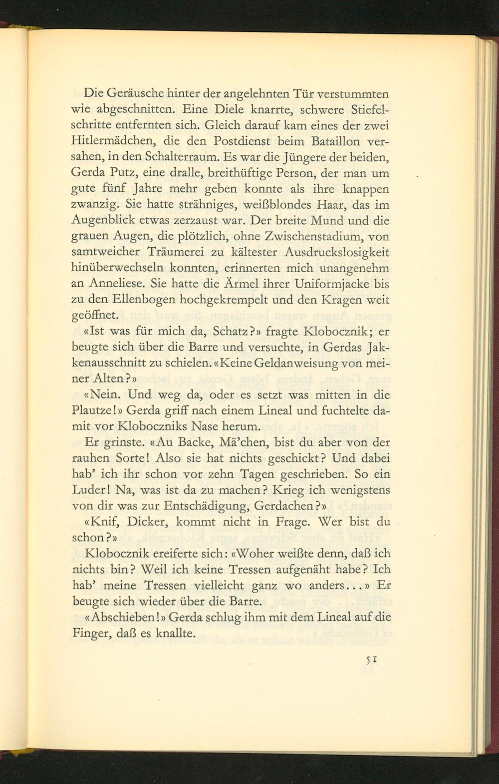 Die Gerãusche hinter der angelehnten Tür verstummten wie abgeschnitten. EFine Diele knarrte, schwere Stiefel- schritte entfernten sich. Gleich darauf kam eines der zwei Hitlermãdchen, die den Postdienst beim Bataillon ver- sahen, in den Schalterraum. Es war die Jüngere der beiden, Gerda Putz, eine dralle, breithüftige Person, der man um gute fünf Jahre mehr geben konnte als ihre knappen zwarzig. Sie hatte strähniges, weißblondes Haar, das im Augenblick etwas zerzaust war. Der breite Mund und die grauen Augen, die plõtzlich, ohne Zwischenstadium, von Samtweicher Träumerei zu kältester Ausdruckslosigkeit hinüberwechseln konnten, erinnerten mich unangenehm an Anneliese. Sie hatte die Armel ihrer Uniformjacke bis zu den Ellenbogen hochgekrempelt und den Kragen weit geõffnet.