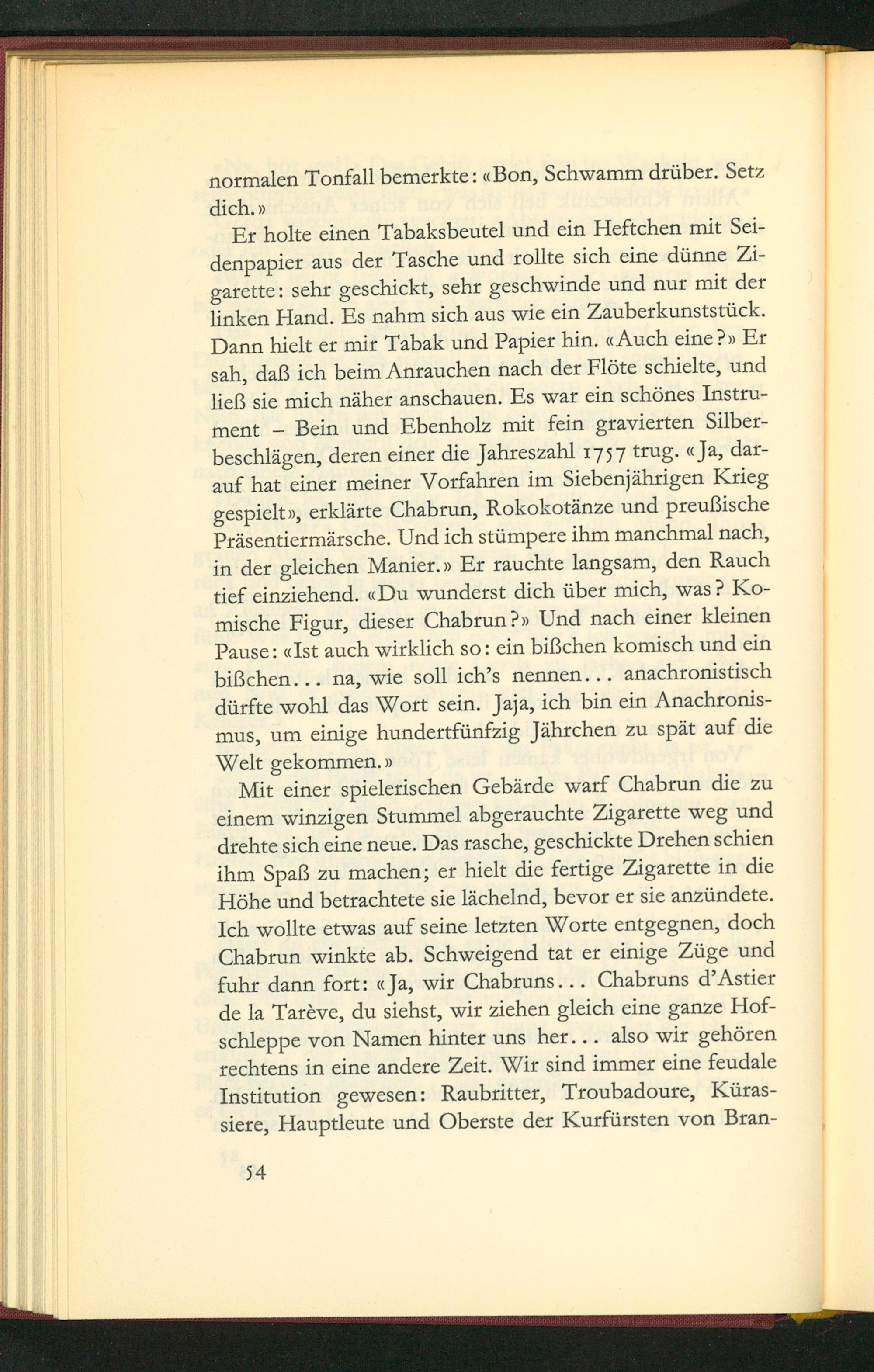 Er holte einen Tabaksbeutel und ein Heftchen mit Sei- denpapier aus der Tasche und rollte sich eine dũnne Zi- garette: schr geschickt, schr geschwinde und nur mit der ſinken Hand. Es nahm sich aus wie ein Zauberkunststück. Pann hielt er mir Tabak und Papier hin. Auch eine?» Er sah, daß ich beim Anrauchen nach der Flõte schielte, und ließ sie mich nãher anschauen. Es war ein schõnes Instru- ment— Bein und Ebenholz mit fein gravierten Silber- beschlägen, deren einer die Jahreszahl 1737 trug. Ja, dar- auf hat einer meiner Vorfahren im Siebenjährigen Krieg gespieltv, erklärte Chabrun, Rokokotänze und preußische Prãsentiermãrsche. Und ich stũmpere ihm manchmal nach, in der gleichen Manier. Er rauchte langsam, den Rauch tief einzichend. Du wunderst dich über mich, was? Ko- mische Figur, dieser Chabrun? Und nach einer kleinen pause: aIst auch wirklich so: ein biſichen komisch und ein bißchen... na, wie soll ich's nennen... anachronistisch qürfte wohl das Wort sein. Jaja, ich bin ein Anachronis- mus, um einige hundertfünfzig Jährchen zu spät auf die Welt gekommen.*