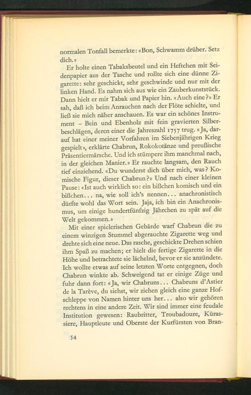 Mit einer spielerischen Gebärde warf Chabrun die zu einem winzigen Stummel abgerauchte Zigarette weg und drehte sich eine neue. Das rasche, geschickte Drehen schien ihm Spaß zu machen; er hielt die fertige Zigarette in die Hõhe und pbetrachtete sie lãchelnd, bevor er sie anzündete. Ich wollte etwas auf seine letzten Worte entgegnen, doch Chabrun winkte ab. Schweigend tat er einige Züge und fuhr dann fort:«Ja, wir Chabruns... Chabruns d'Astier de la Tarève, du siehst, wir zichen gleich eine ganze Hof- schleppe von Namen hinter uns her... also wir gechören rechtens in eine andere Zeit. Wir sind immer eine feudale Institution gewesen: Raubritter, Troubadoure, Küras- siere, Hauptleute und Oberste der Kurfürsten von Bran-
