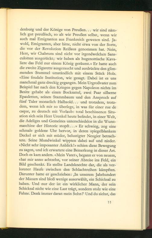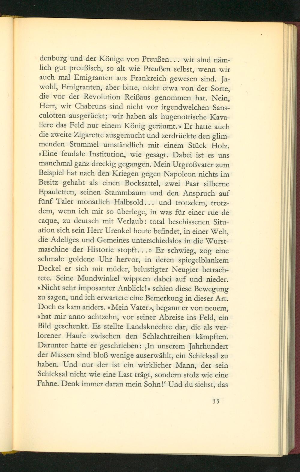 denburg und der Kõnige von Preußen... wir sind nãm- lich gut preußisch, so alt wie Preußen selbst, wenn wir auch mal Emigranten aus Frankreich gewesen sind. Ja- wohl, Emigranten, aber bitte, nicht etwa von der Sorte, die vor der Revolution Reißaus genommen hat. Nein, Herr, wir Chabruns sind nicht vor irgendwelchen Sans- culotten ausgerũckt; wir haben als hugenottische Kava- liere das Feld nur einem Kõnig geräumt.v Er hatte auch die ⁊weite Zigarette ausgeraucht und zerdrũckte den glim- menden Stummel umständlich mit einem Stück Holz. Eine feudale Institution, wie gesagt. Dabei ist es uns manchmal ganz dreckig gegangen. Mein Urgroßvater zum Beispiel hat nach den Kriegen gegen Napoleon nichts im Besitz gehabt als einen Bocksattel, zwei Paar silberne Epauletten, seinen Stammbaum und den Anspruch auf fünf Taler monatlich Halbsold... und trotzdem, trotz- dem, wenn ich mir so überlege, in was für einer rue de caque, zu deutsch mit Verlaub: total beschissenen Situ- ation sich sein Hert Urenkel heute befindet, in einer Welt, die Adeliges und Gemeines unterschiedslos in die Wurst- maschine der Historie stopft... v Er schwieg, z0g eine schmale goldene Uhr hervor, in deren spiegelblankem Peckel er sich mit mũder, belustigter Neugier betrach- tete. Seine Mundwinkel wippten dabei auf und nieder. Nicht schr imposanter Anblick lv schien diese Bewegung zu sagen, und ich erwartete eine Bemerkung in dieser Art. Poch es kam anders. Mein Vaterꝰ, begann er von neuem, chat mir anno achtzehn, vor seiner Abreise ins Feld, ein Bild geschenkt. Es stellte Landsknechte dar, die als ver- lorener Haufe zwischen den Schlachtreihen kämpften. Parunter hatte er geschrieben:„In unserem Jahrhundert der Massen sind bloß wenige auserwählt, ein Schicksal zu haben. Und nur der ist ein wirklicher Mann, der sein Schicksal nicht wie eine Last trägt, sondern stolz wie eine Fahne. Denk immer daran mein Sohn!“ Und du sichst, das
