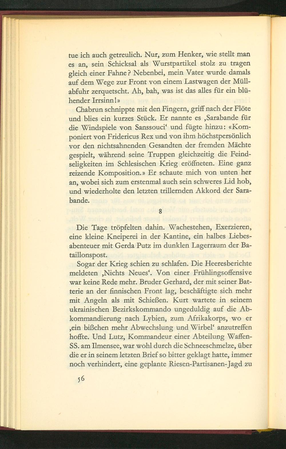 Chabrun schnippte mit den Fingern, griff nach der Flõte und blies ein kurzes Stück. EHr nannte es„Sarabande für die Windspiele von Sanssouci? und fügte hinzu: Kom- poniert von Fridericus Rex und von ihm hõchstpersõnlich vor den nichtsahnenden Gesandten der fremden Mächte gespielt, wãhrend seine Truppen gleichzeitig die Feind- seligkeiten im Schlesischen Krieg eröffneten. Eine ganz reizende Kormposition.v Er schaute mich von unten her an, wobei sich zum erstenmal auch sein schweres Lid hob, und wiederholte den letzten trillernden Akkord der Sara- bande.