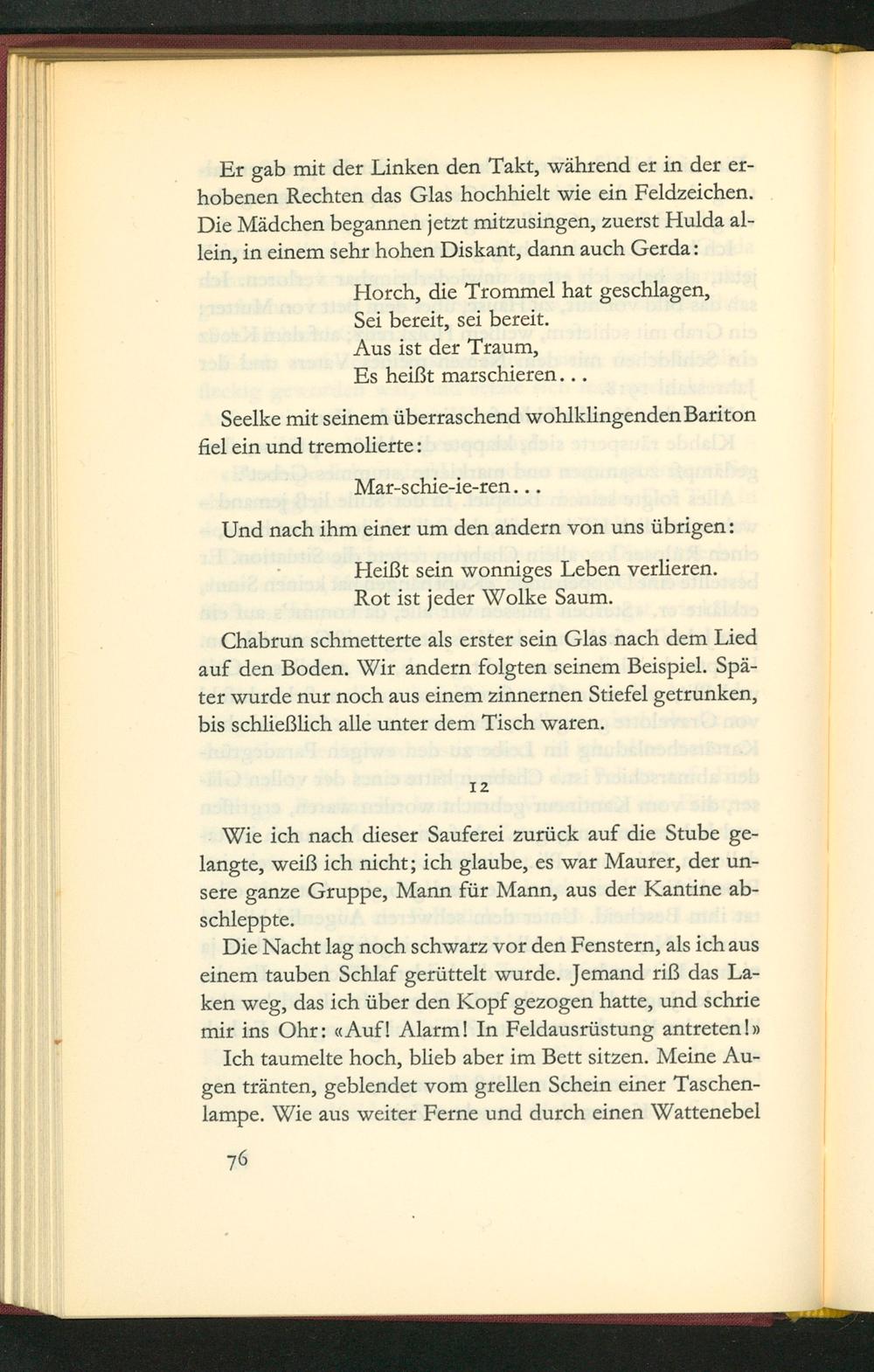 Wie ich nach dieser Sauferei zurück auf die Stube ge- langte, weiß ich nicht; ich glaube, es war Maurer, der un- sere ganze Gruppe, Mann für Mann, aus der Kantine ab- Schleppte.