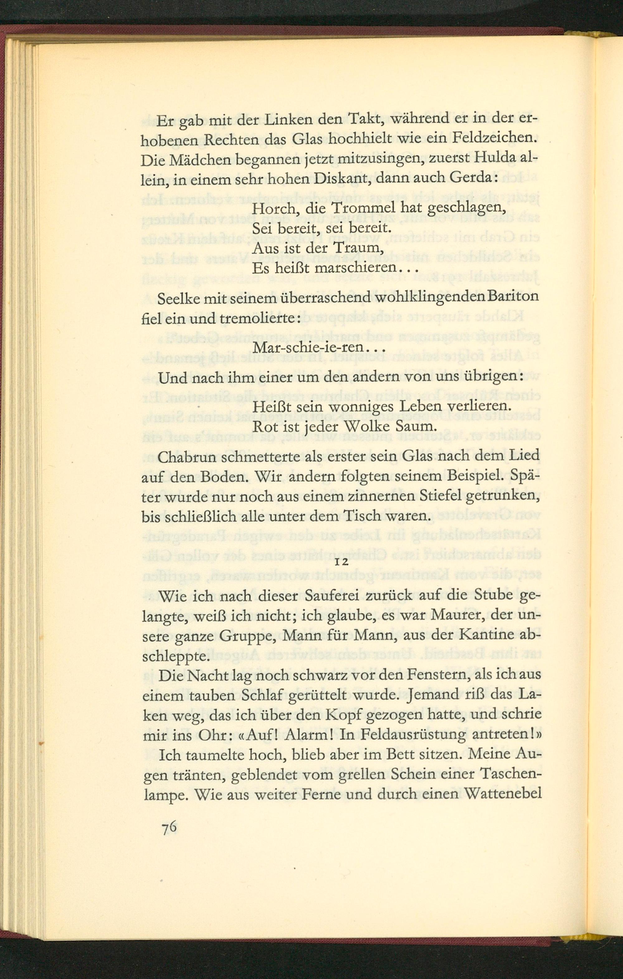 Er gab mit der Linken den Takt, während er in der er- hobenen Rechten das Glas hochhielt wie ein Feldzeichen. Die Mãdchen hegannen jetzt mitzusingen, zuerst Hulda al- lein, in einem sehr hohen Diskant, dann auch Gerda: