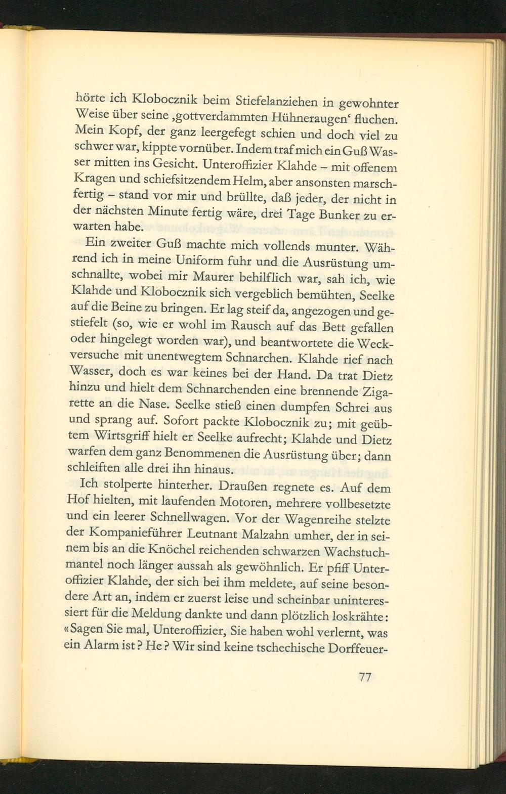Ich stolperte hinterher. Draußen regnete es. Auf dem Hof hielten, mit laufenden Motoren, mehrere vollbesetzte und ein leerer Schnellwagen. Vor der Wagenreihe stelzte der Kompanieführer Leutnant Malzahn umher, der in sei- nem bis an die Knõchel reichenden schwarzen Wachstuch- mantel noch länger aussah als gewöhnlich. Er pfiff Unter- offizier Klahde, der sich bei ihm meldete, auf seine beson- dere Art an, indem er zuerst leise und scheinbar uninteres- siert für die Meldung dankte und dann plõtzlich los krãhte: Sagen Sie mal, Unteroffizier, Sie haben wohl verlernt, was ein Alarm ist? He? Wir sind keine tschechische Porffeuer-