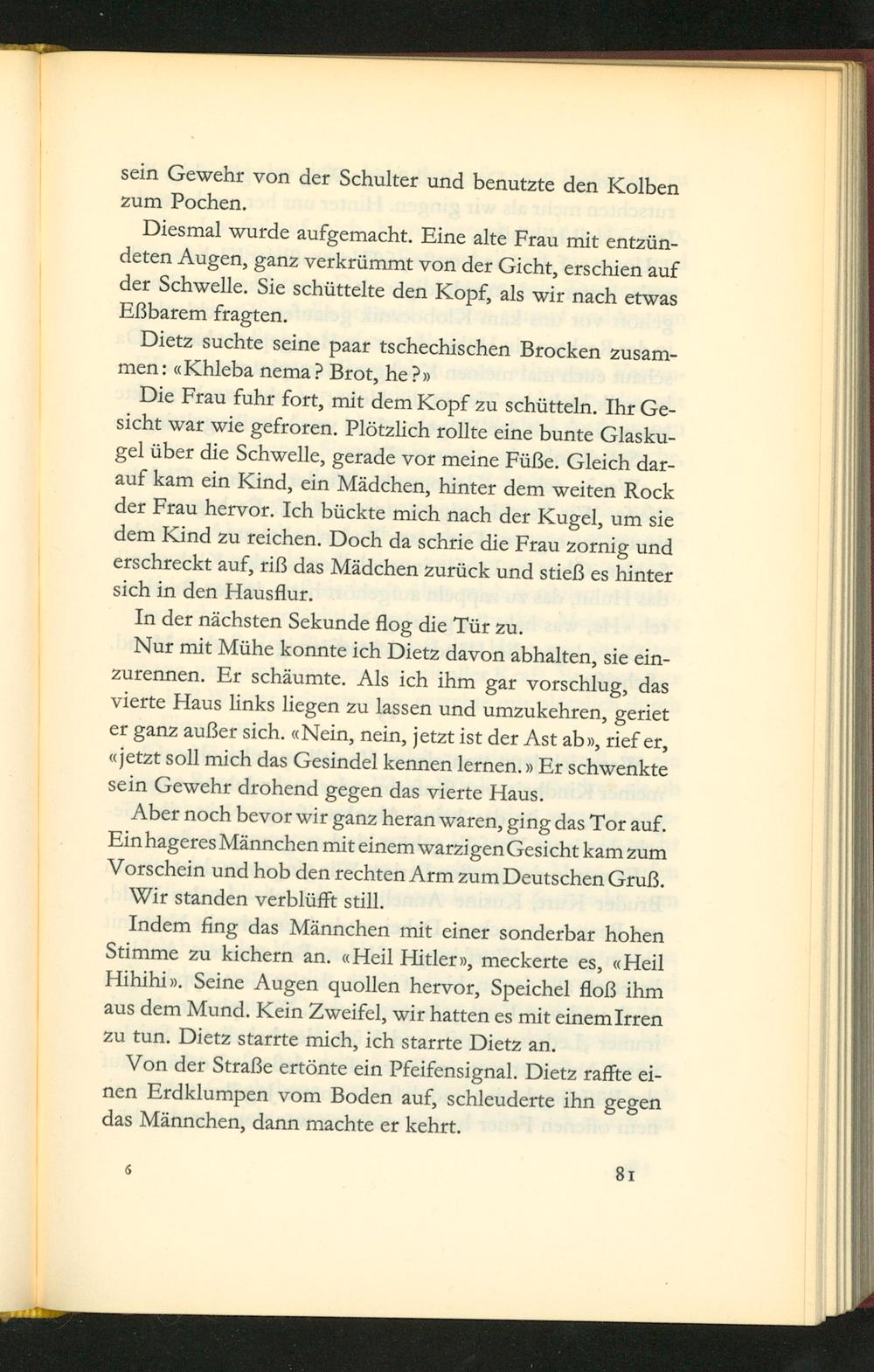 Die Frau fuhr fort, mit dem Kopf zu schütteln. Ihr Ge- sicht war wie gefroren. Plõtzlich rolite eine bunte Glasku- gel über die Schwelle, gerade vor meine Füße. Gleich dar- auf kam ein Kind, ein Mãdchen, hinter dem weiten Rock der Frau hervor. Ich pückte mich nach der Kugel, um sie dem Kind zu reichen. Doch da Schrie die Frau zornig und erschreckt auf, riß das Mãdchen zurück und stieß es hinter sich in den Hausflur.