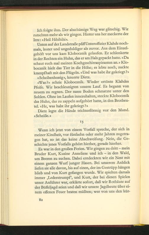 Es war in den großen Ferien. Wir gingen zu dritt= mein Bruder Kurt, Kusine Anneliese und ich— in den Wald, um Beeren zu suchen. Dabei entdeckten wir ein Nest mit einem ganzen Wurf junger Hasen. Bei unserem Anblick liefen sie alle davon, bis auf einen, der im Gestrũpp hãngen blieb und von Kurt gefangen wurde. Wir spielten damals immer„Lederstrumpf “, und Kurt, der bei diesen Spielen unser Anführer war, erklärte sofort, daß wir Rothäute auf der Büffeljagd seien und daß wir unsere Jagdbeute über eit nem offenen Feuer braten müßten; wer von uns den kür-