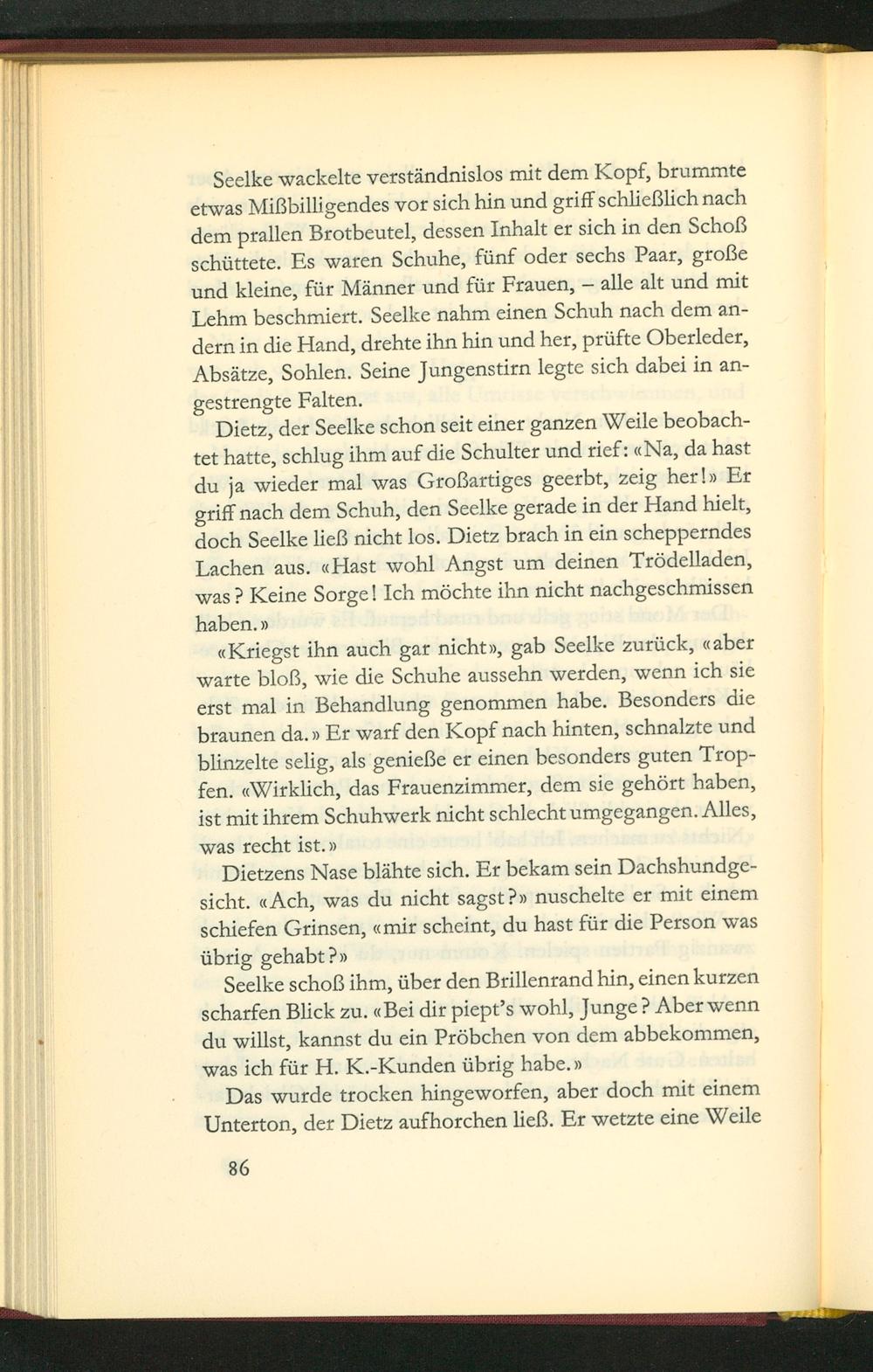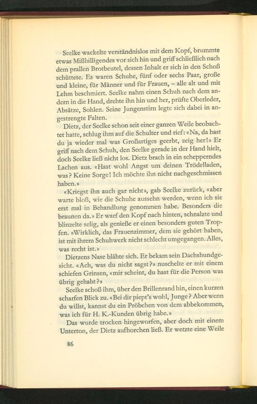 Dietz, der Seelke schon seit einer ganzen Weile beobach- tet hatte, schlug ihm auf die Schulter und rief:«Na, da hast du ja wieder mal was Großartiges geerbt, zeig herlv Er grif᷑ nach dem Schuh, den Scelke gerade in der Hand hielt, doch Seelke ließ nicht los. Dietz prach in ein schepperndes Lachen aus.«Hast wohl Angst um deinen Trödelladen, was? Keine Sorge! Ich mõchte ihn nicht nachgeschmissen haben.