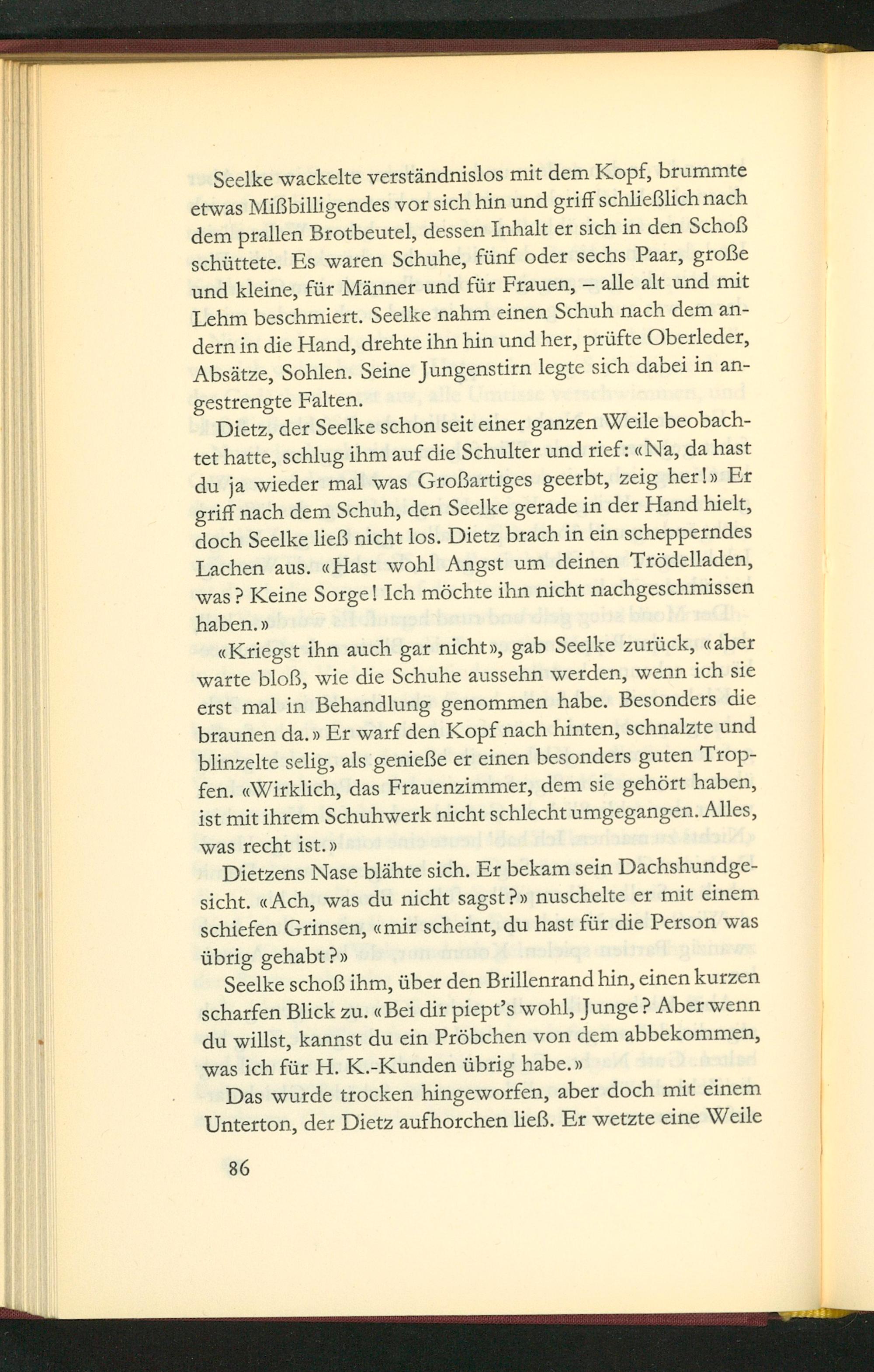 Seelke schoß ihm, über den Brillenrand hin, einen kurzen Scharfen Blick zu.(Bei dir piept's wohl, Junge? Aber wenn du willst, kannst du ein Prõbchen von dem abbekommen, was ich für H. K.Kunden übrig habe.»