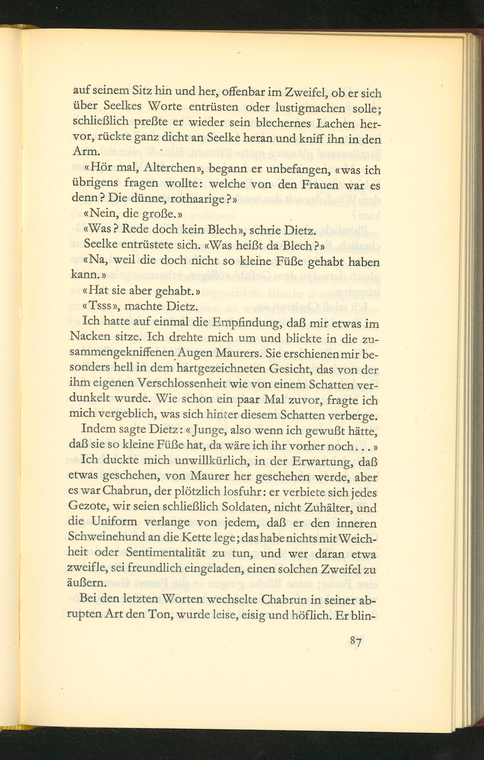 Ich duckte mich unwillkürlich, in der Erwartung, daß etwas geschehen, von Maurer her geschehen werde, aber es war Chabrun, der plõtzlich losfuhr: er verbiete sich jedes Gezote, wir seien schließlich Soldaten, nicht Zuhälter, und die Uniform verlange von jedem, daß er den inneren Schweinehund an die Kette lege; das habe nichts mit Weich- heit oder Sentimentalität zu tun, und wer daran etwa zweifle, sei freundlich eingeladen, einen solchen Zweifel zu äußern.