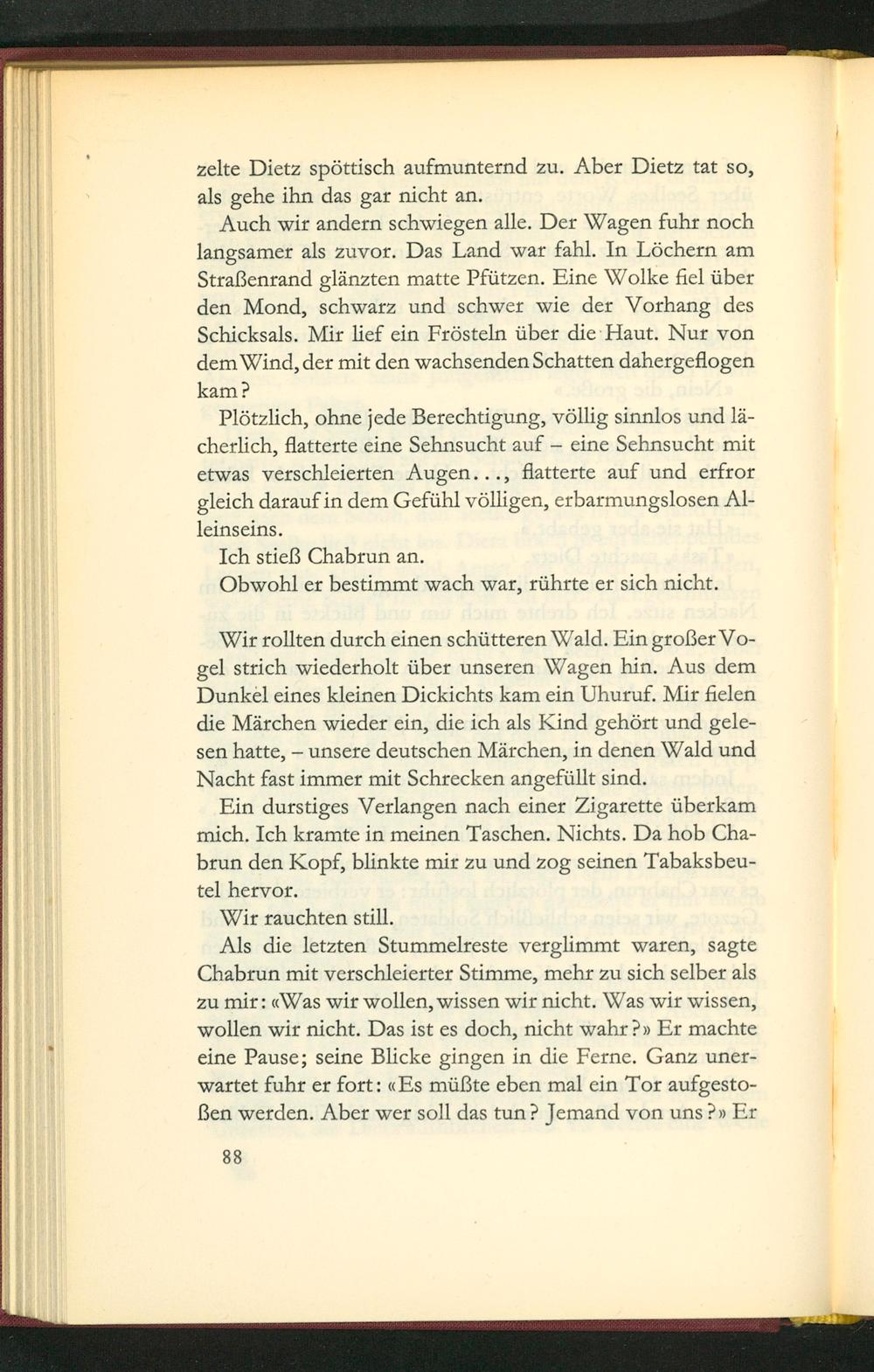 Als die letzten Stummelreste verglimmt waren, sagte Chabrun mit verschleierter Stimme, mehr zu sich selber als zu mir: Was wir wollen, wissen wir nicht. Was wir wissen, Wwollen wir nicht. Das ist es doch, nicht wahr? Er machte eine Pause; seine Blicke gingen in die Ferne. Ganz uner- wartet fuhr er fort: Es mũßte eben mal ein Tor aufgesto- Ben werden. Aber wer soll das tun? Jſemand von uns?» Er