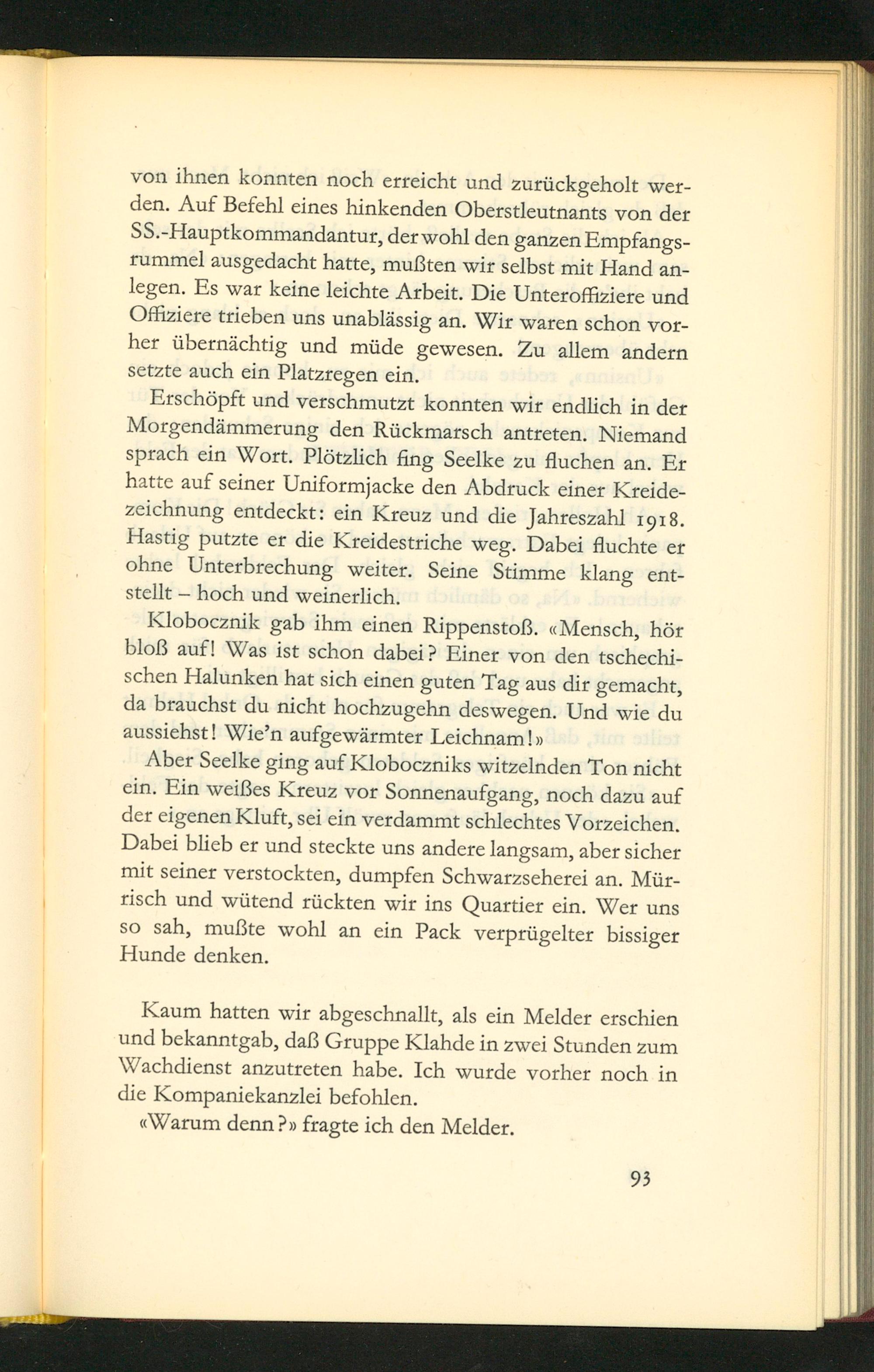 Aber Seelke ging auf᷑ Kloboczniks witzelnden Ton nicht ein. Fin weißes Kreuz vor Sonnenaufgang, noch dazu auf der eigenen Kluft, sei ein verdammt schlechtes Vorzeichen. Pabei blieb er und steckte uns andere langsam, aber sicher mit seiner verstockten, dumpfen Schwarzseherei an. Mür- risch und wütend rũckten wir ins Quartier ein. Wer uns
