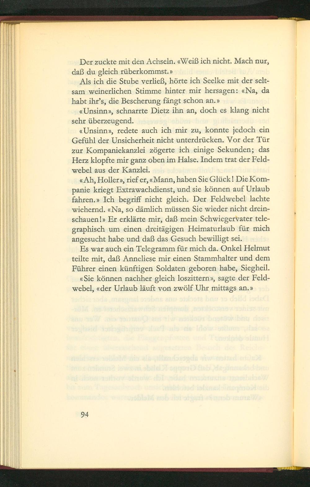 (Ah, Hollerv, rief er, Mann, haben Sie Glück! Die Kom- panie kriegt Extrawachdienst, und sie können auf Urlaub fahren.» Ich begriff nicht gleich. Der Feldwebel lachte wiehernd.«(Na, so dämlich müssen Sie wieder nicht drein- schauen 1* Er erklärte mir, daß mein Schwiegervater tele- graphisch um einen dreitägigen Heimaturlaub für mich angesucht habe und daß das Gesuch bewilligt sei.