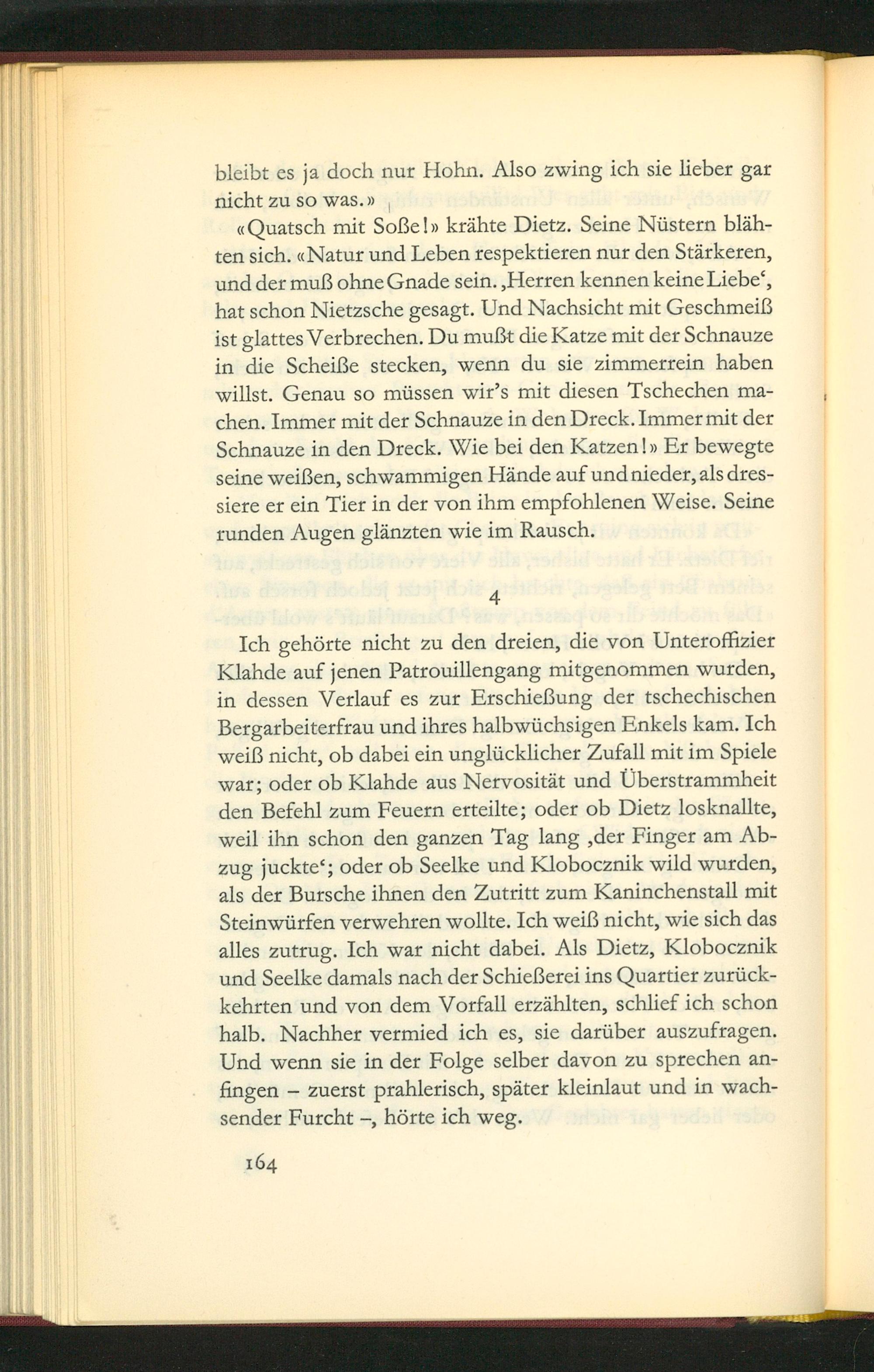 Ich gehörte nicht zu den dreien, die von Unteroffizier Klahde auf jenen Patrouillengang mitgenommen wurden, in dessen Verlauf es zur Erschießung der tschechischen Bergarbeiterfrau und ihres halbwüchsigen Enkels kam. Ich weiß nicht, ob dabei ein unglũcklicher Zufall mit im Spiele war; oder ob Klahde aus Nervosität und Uberstrammheit den Befehl zum Feuern erteilte; oder ob Dietz losknallte, weil ihn schon den ganzen Tag lang der Finger am Ab- zug juckte?; oder ob Seelke und Klobocznik wild wurden, als der Bursche ihnen den Zutritt zum Kaninchenstall mit Steinwürfen verwehren wollte. Ich weiß nicht, wie sich das alles zutrug. Ich war nicht dabei. Als Dietz, Klobocznik und Seelke damals nach der Schießerei ins Quartier zurũck- kehrten und von dem Vorfall erzählten, schlief ich schon halb. Nachher vermied ich es, sie darüber auszufragen. Und wenn sie in der Folge selber davon zu sprechen an- fingen— zuerst prahlerisch, später kleinlaut und in wach- sender Furcht—, hörte ich weg.