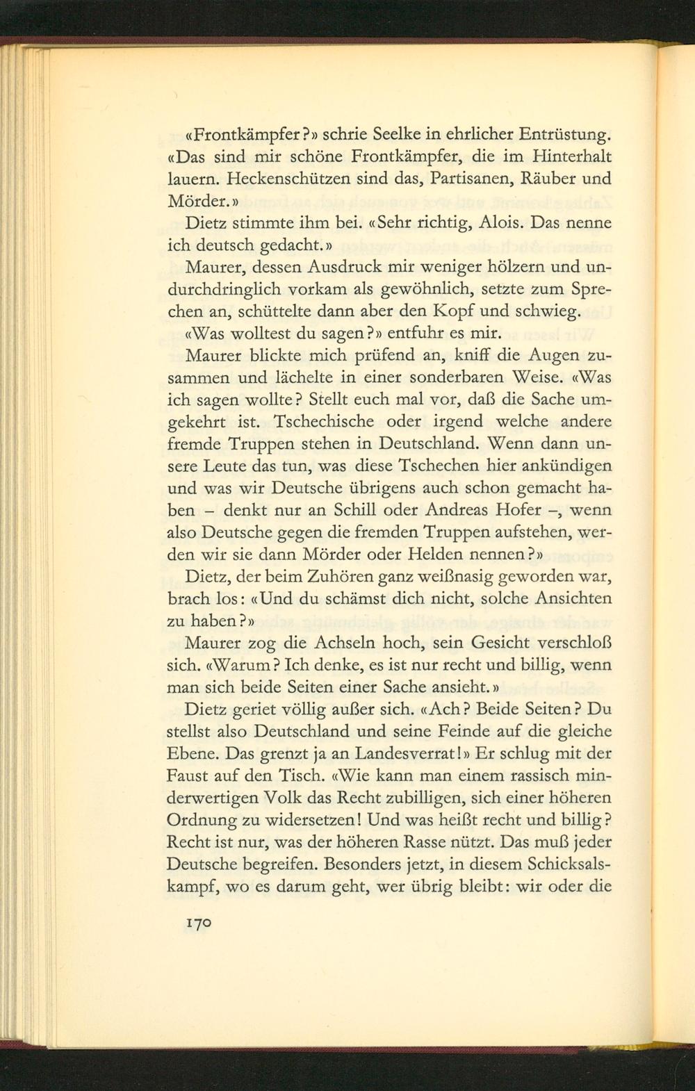 Maurer blickte mich prüfend an, kniff die Augen zu- sammen und lächelte in einer sonderbaren Weise. Was ich sagen wollte? Stellt euch mal vor, daß die Sache um- gekehrt ist. Tschechische oder irgend welche andere fremde Truppen stehen in Deutschland . Wenn dann un- sere Leute das tun, was diese Tschechen hier ankündigen und was wir Deutsche übrigens auch schon gemacht ha- ben— denkt nur an Schill oder Andreas Hofer—, wenn also Deutsche gegen die fremden Truppen aufstehen, wer- den wir sie dann Mörder oder Helden nennen dv