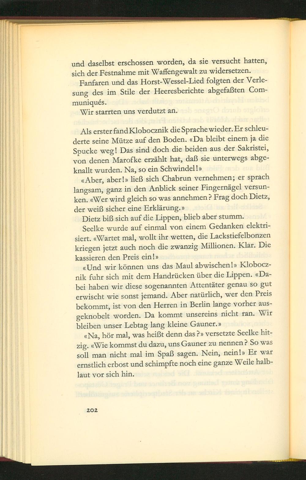 Als erster fand Klobocznik die Sprache wieder. Er schleu- derte seine Mütze auf den Boden. Da bleibt einem ja die Spucke weg! Das Sind doch die beiden aus der Sakristei, von denen Marofke erzählt hat, daß sie unterwegs abge- knallt wurden. Na, so ein Schwindell