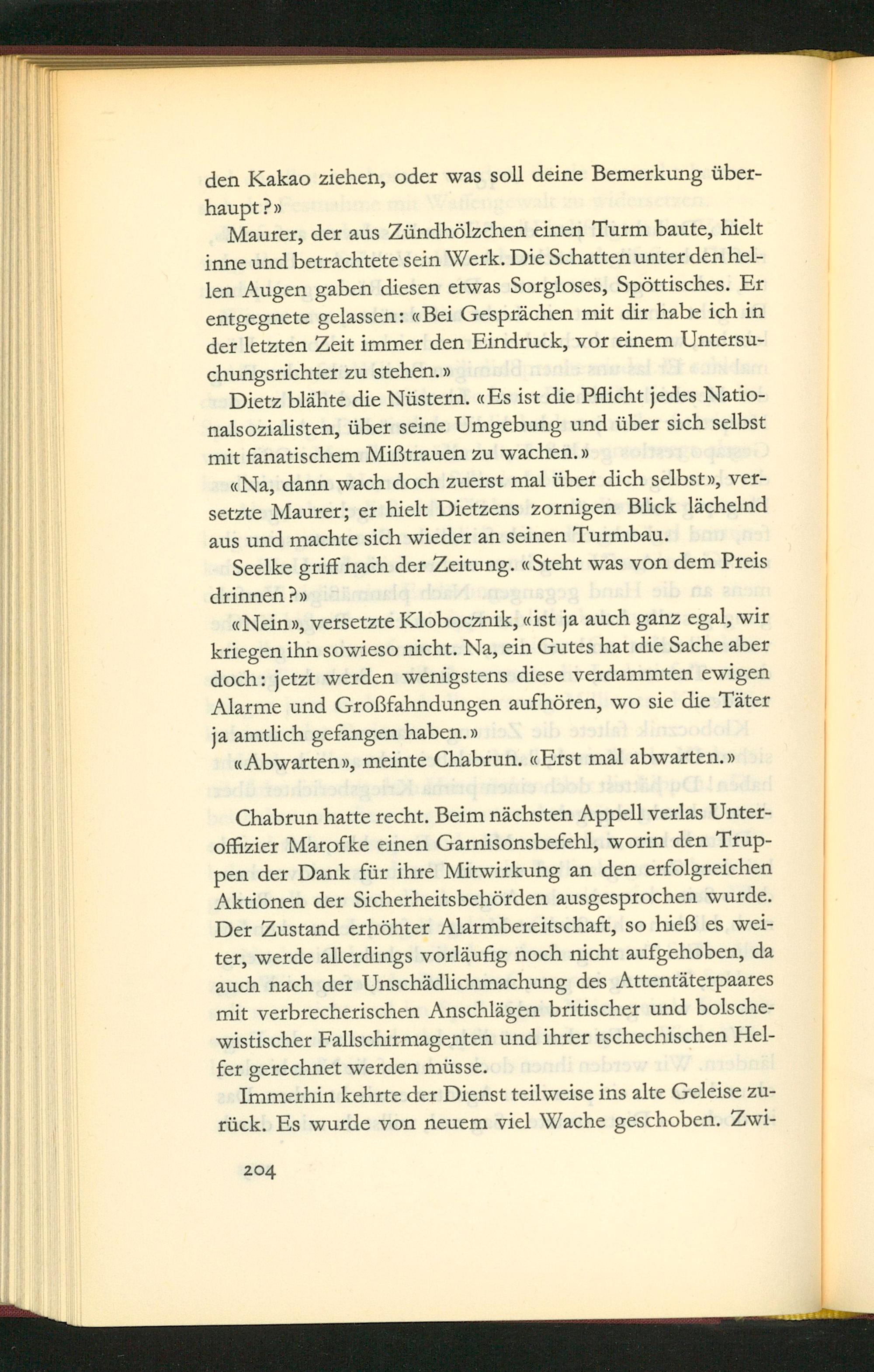 Chabrun hatte recht. Beim nãchsten Appell verlas Unter- offizier Marofke einen Garnisonsbefehl, worin den Trup- pen der Dank für ihre Mitwirkung an den erfolgreichen Aktionen der Sicherheitsbehörden ausgesprochen wurde. Der Zustand erhöhter Alarmbereitschaft, so hieß es wei- ter, werde allerdings vorlãufig noch nicht aufgehoben, da auch nach der Unschädlichmachung des Attentäterpaares mit verbrecherischen Anschlägen britischer und bolsche- wistischer Fallschirmagenten und ihrer tschechischen Hel- fer gerechnet werden müsse.