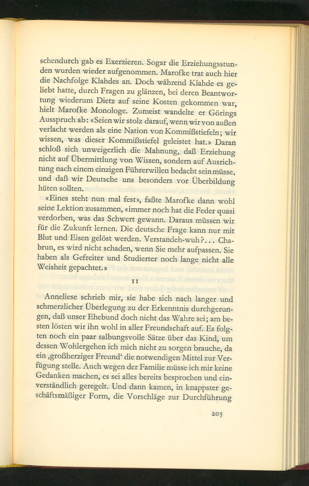 schendurch gab es Exerzieren. Sogar die Erzichungsstun- den wurden wieder aufgenommen. Marofke trat auch hier die Nachfolge Klahdes an. Doch während Klahde es ge- liebt hatte, durch Fragen zu glänzen, bei deren Beantwor- tung wiederum Dietz auf seine Kosten gekommen war, hielt Marofke Monologe. Zumeist wandelte er Görings Ausspruch ab: adeien wir stolz darauf, wenn wir von außen verlacht werden als eine Nation von Kommißstiefeln; wir wissen, was dieser Kommißstiefel geleistet hat. Daran schloß sich unweigerlich die Mahnung, daß Erzichung nicht auf Vbermittlung von Wissen, sondern auf Ausrich- tung nach einem einzigen Führerwillen pedacht vein mũsse. und daß wir Deutsche uns pesonders vor Uberbildung hüten sollten.