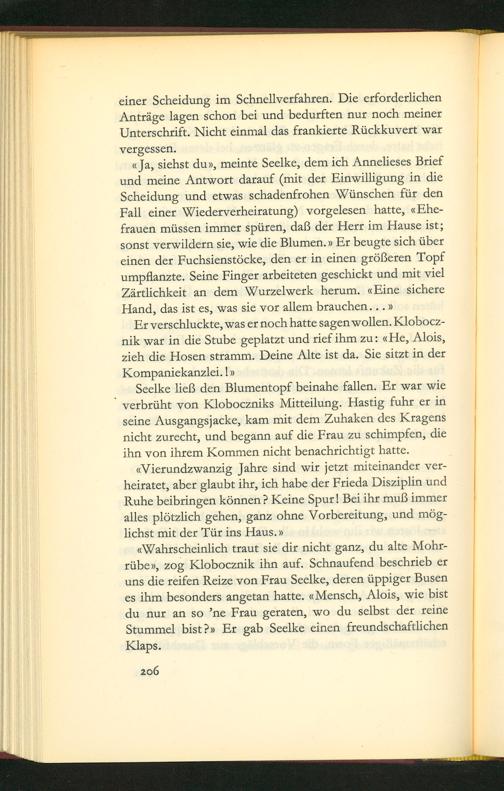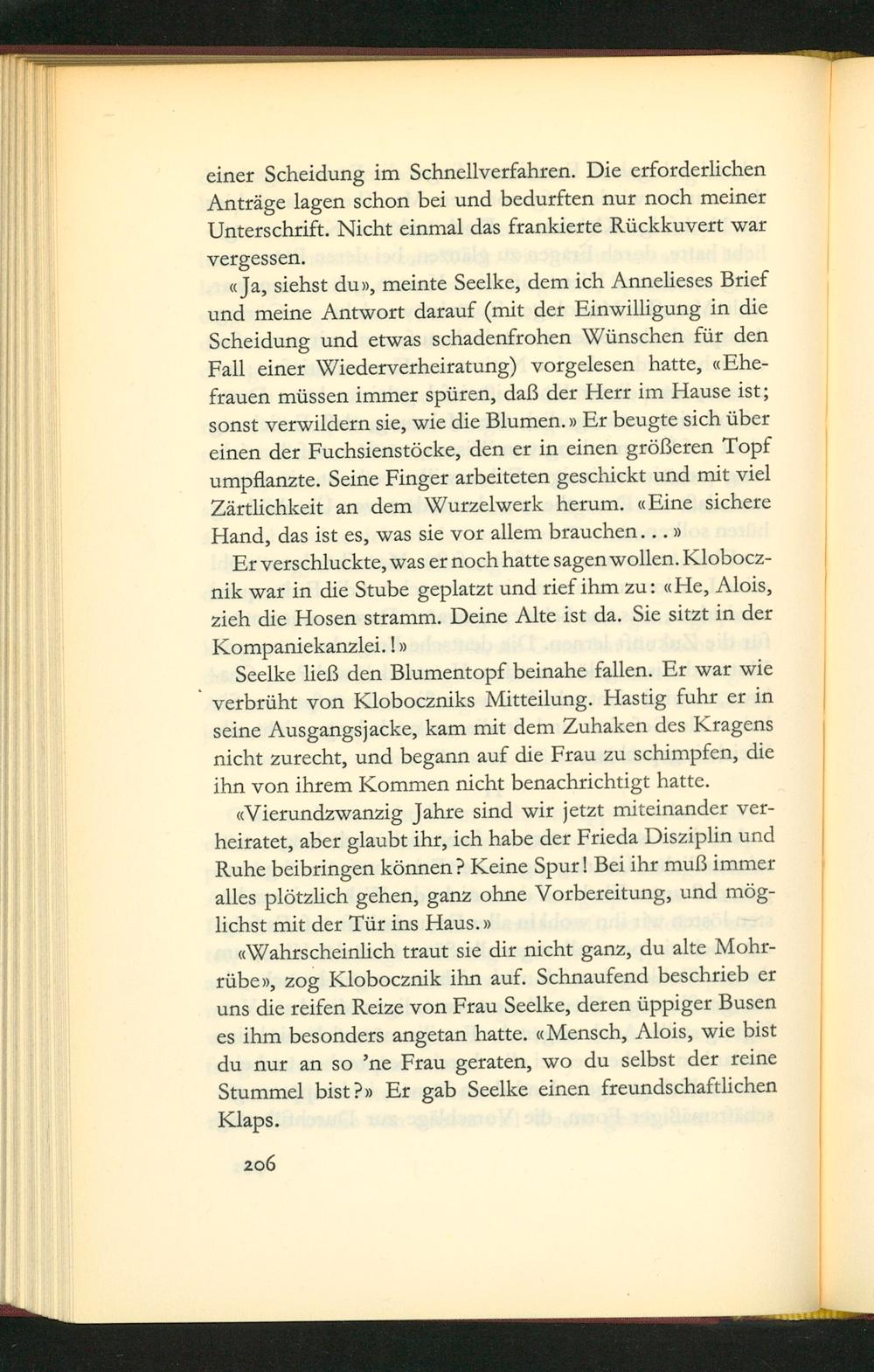 Ja, sichst duv, meinte Seelke, dem ich Annelieses Brief und meine Antwort darauf(mit der Einwilligung in die Scheidung und etwas schadenfrohen Wünschen für den Fall einer Wiederverheiratung) vorgelesen hatte, Ehe- frauen müssen immer spüren, daß der Herr im Hause ist; Sonst verwildern sie, wie die Blumen. v Er beugte sich über cinen der Fuchsienstõcke, den er in einen größeren Topf umpflanzte. Seine Hinger arbeiteten geschickt und mit viel Zärtlichkeit an dem Wurzelwerk herum.«Eine sichere Hand, das ist es, was sie vor allem prauchen...v