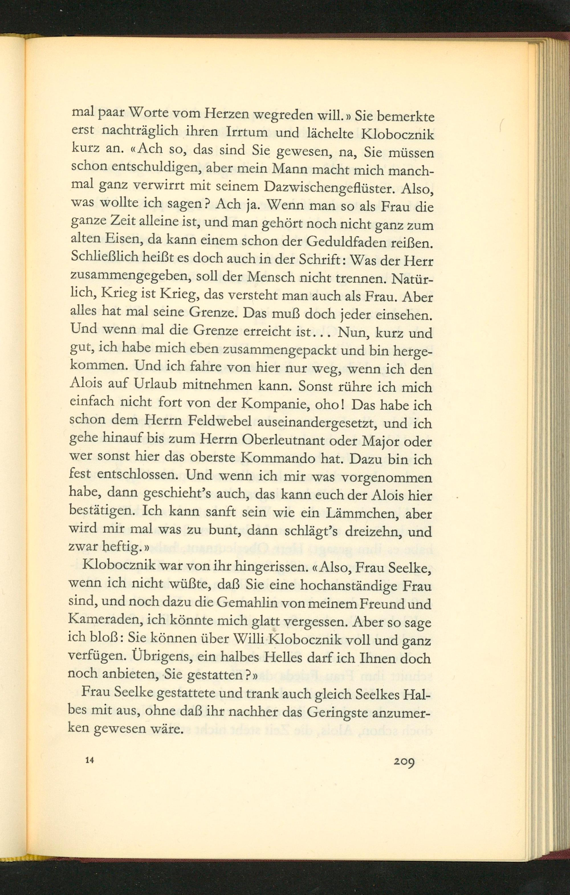 mal paar Worte vom Herzen wegreden will. v Sie bemerkte erst nachträglich ihren Irrtum und lächelte Klobocznik kurz an. Ach so, das sind Sie gewesen, na, Sie müssen schon entschuldigen, aber mein Mann macht mich manch- mal ganz verwirrt mit seinem Pazwischengeflüster. Also, was wollte ich sagen? Ach ja. Wenn man so als Frau die ganze Zeit alleine ist, und man gehört noch nicht ganz zum alten Hisen, da kann einem schon der Geduldfaden reißen. Schließlich heißt es doch auch in der Schrift: Was der Herr Zusammengegeben, soll der Mensch nicht trennen. Natür- lich, Krieg ist Krieg, das versteht man auch als Frau. Aber alles hat mal seine Grenze. Das muß doch jeder einsehen. Und wenn mal die Grenze erreicht ist.. Nun, kurz und gut, ich habe mich eben zusammengepackt und bin herge- kommen. Und ich fahre von hier nur weg, wenn ich den Mois auf Urlaub mitnehmen kann. Sonst rũhre ich mich einfach nicht fort von der Kompanie, oho! Das habe ich schon dem Herrn Feldwebel auseinandergesetzt, und ich gehe hinauf bis zum Herrn Oberleutnant oder Major oder wer sonst hier das oberste Kommando hat. Dazu bin ich fest entschlossen. Und wenn ich mir was vorgenommen habe, dann geschicht's auch, das kann euch der Alois hier bestãtigen. Ich kann sanft sein wie ein Lämmchen, aber wird mir mal was zu bunt, dann schlägt's dreizehn, und zwar heftig.*