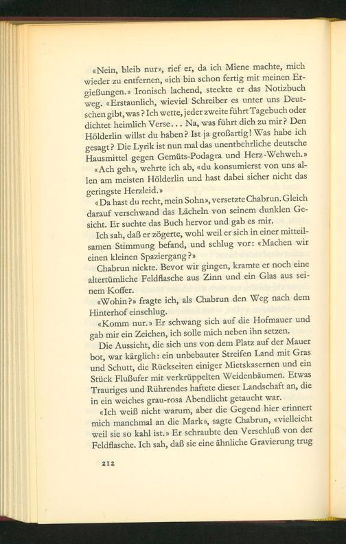 Die Aussicht, die sich uns von dem Platz auf der Mauer pot, war kärglich: ein unbebauter Streifen Land mit Gras und Schutt, die Rückseiten einiger Mietskasernen und ein Stück Flußufer mit verkrũppelten Weidenbãumen. Etwas Trauriges und Rũhrendes haftete dieser Landschaft an, die in ein weiches grau-rosa Apendlicht getaucht war.